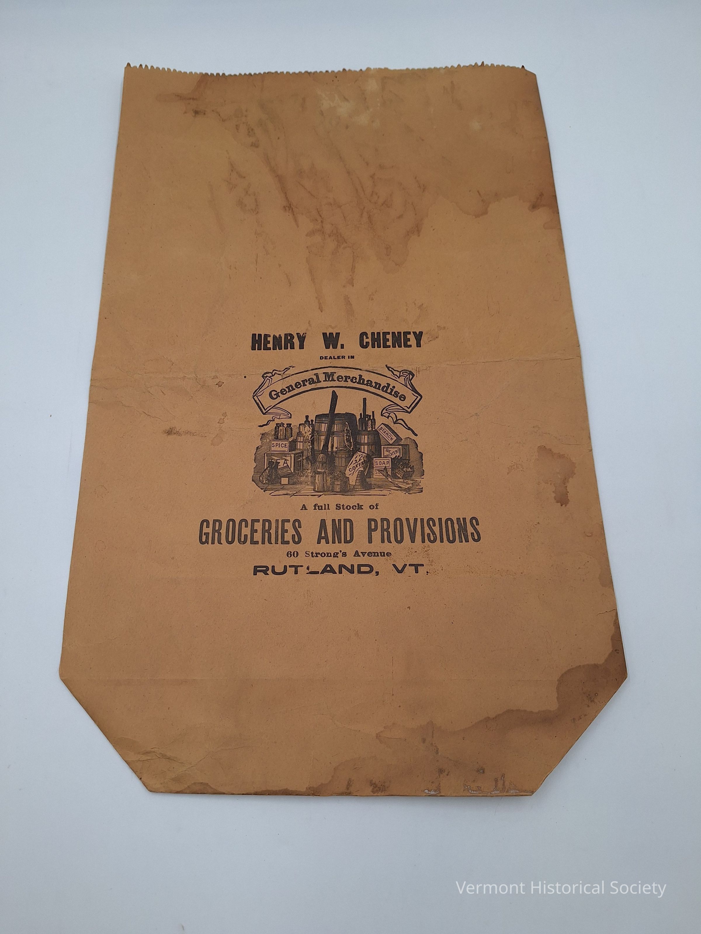 The bag has an image of items that would be in the store and in black print has the following information: "Henry W. Cheney, dealer in general merchandise. A full stock of groceries and provisions, 60 Strong Avenue, Rutland, Vermont."Context