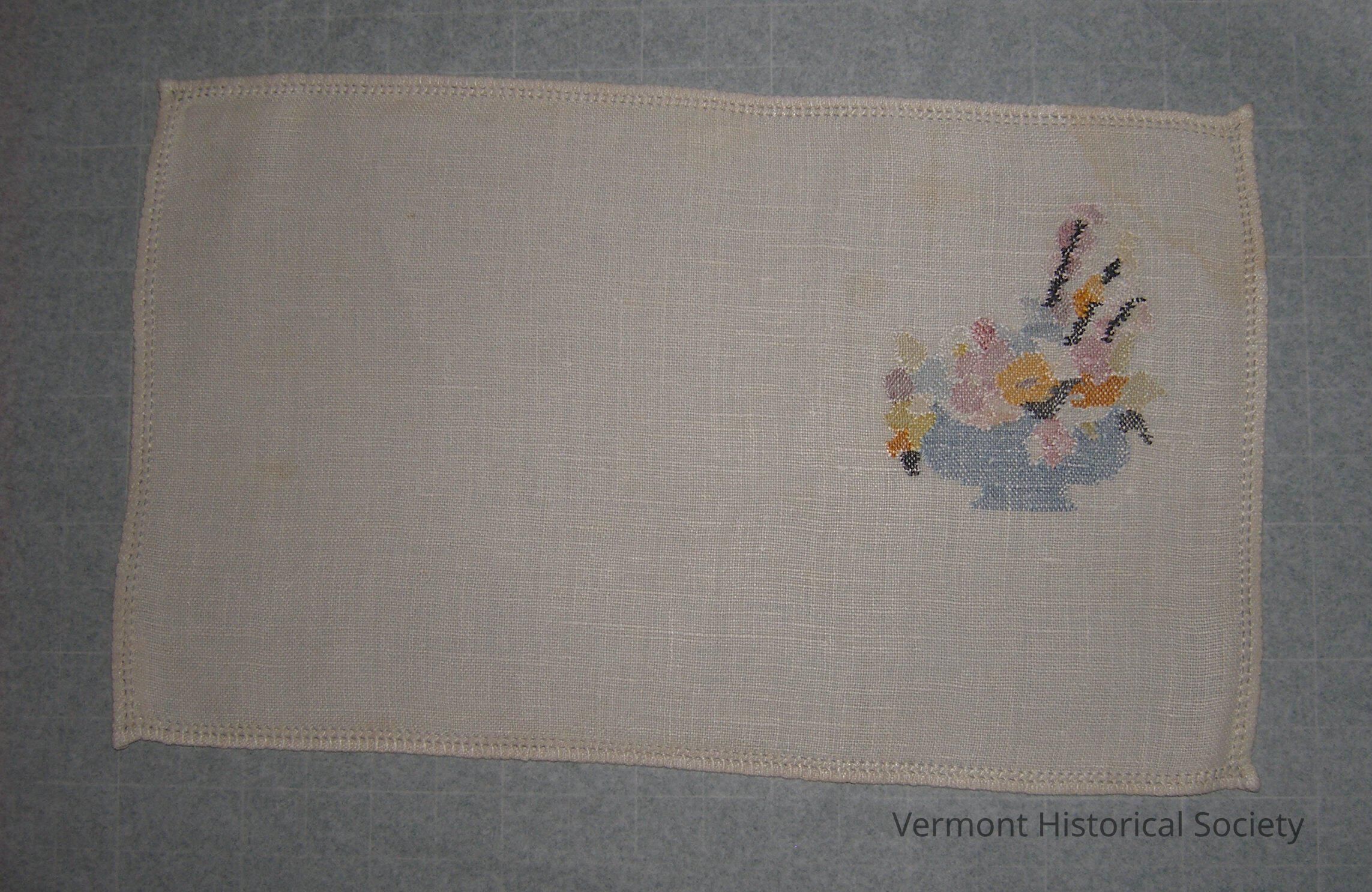 Handwoven tapestry-weave linen table mat with vase of flowers in upper right corner, in pastel shades of blue, yellow, lavender and green with dark gray leaves and stems. Drawn-work border.