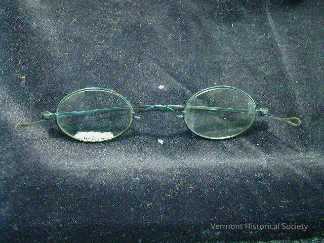 Metal framed eyeglasses with oval clear glass lenses. The temples are straight, just longer than the width of the frame, with lacriform loops at each end.
