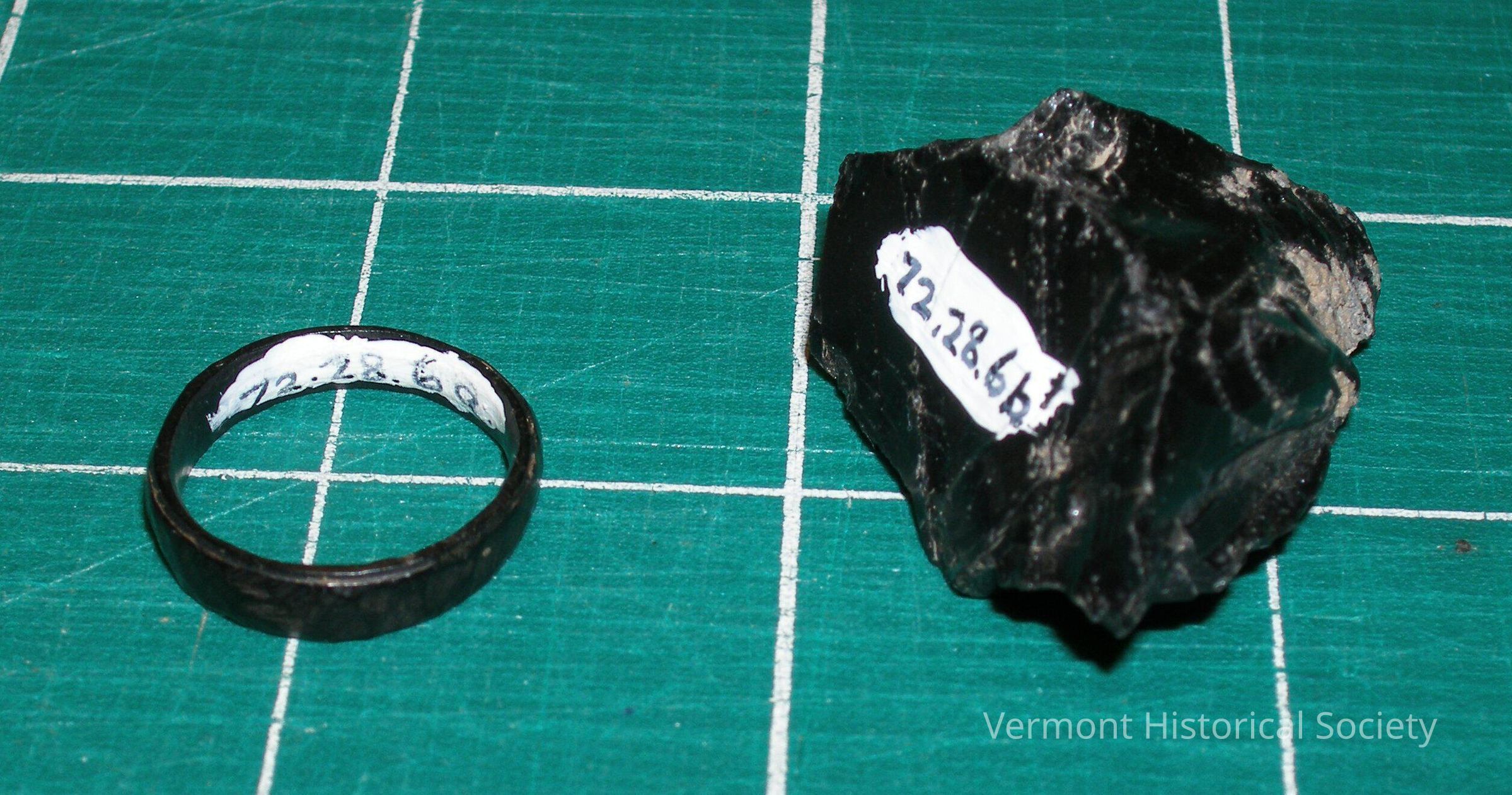 Jet mourning ring and an uncarved piece of jet.