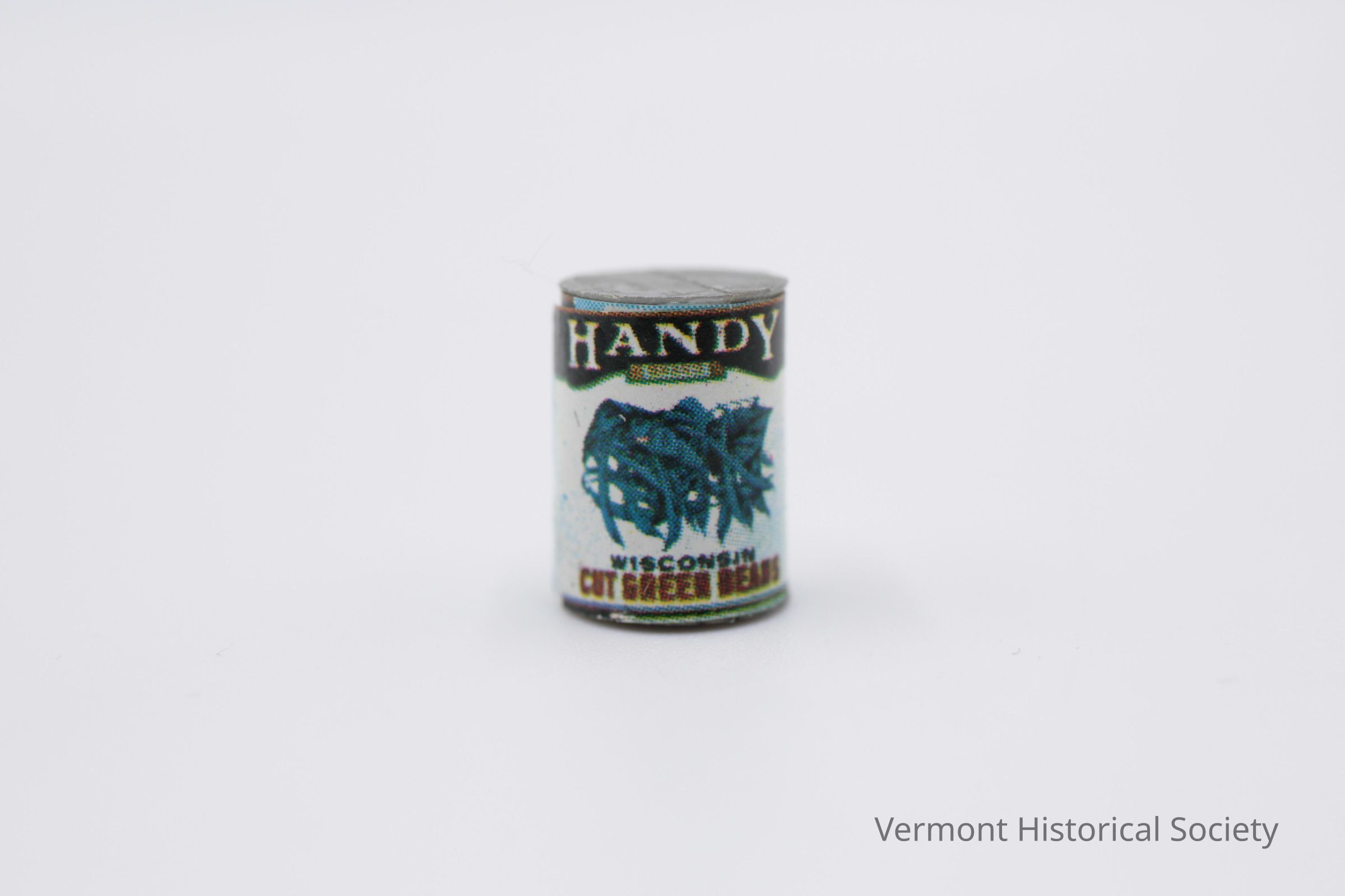 Miniature cylindrical food-storage can. The can is made of silver-colored plastic and is wrapped with a printed paper label. One side of the paper label shows several green beans with the words, "HANDY WISCONSIN CUT GREEN BEANS". The other side shows a woman in a shop uniform gesturing to some shelves with the words, "HANDY CUT GREEN BEANS".Context