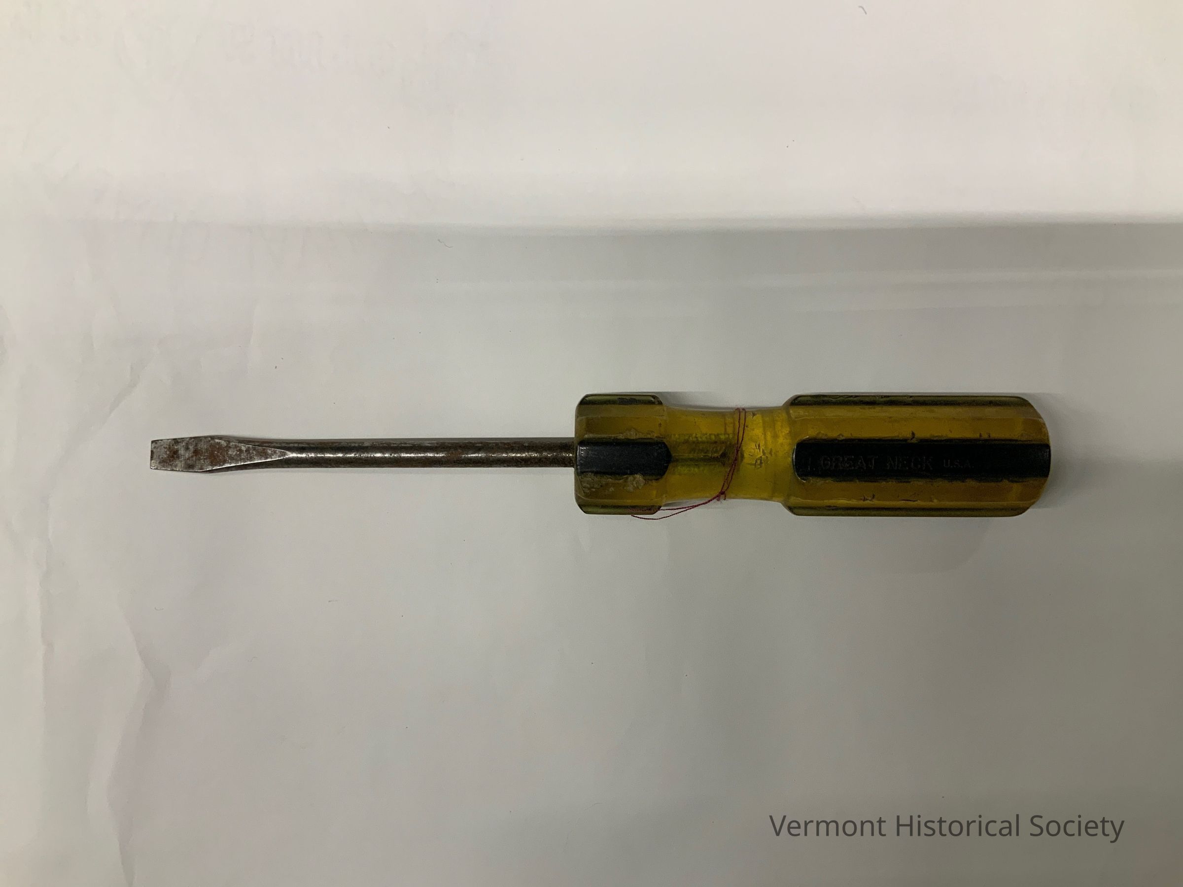 Flathead screwdriver with a semi-clear yellow plastic handle.Context