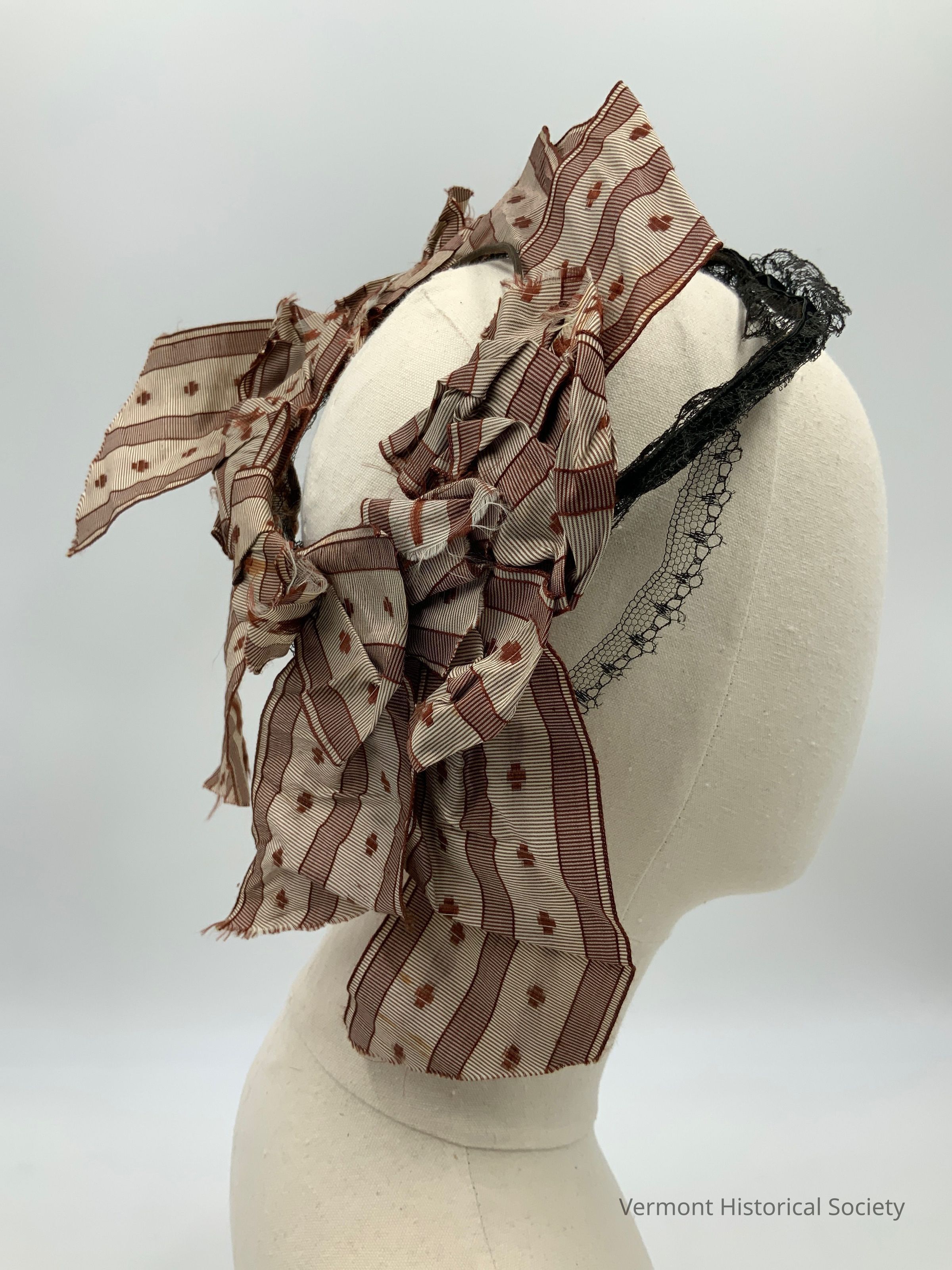 This hat consists of a wire frame that is covered with black lace and burgundy-striped grosgrain ribbon. The ribbon is decoratively wrapped around a round wire at the crown of the hat. The pointed brim of the hat is also made of wire and is wrapped with black lace.