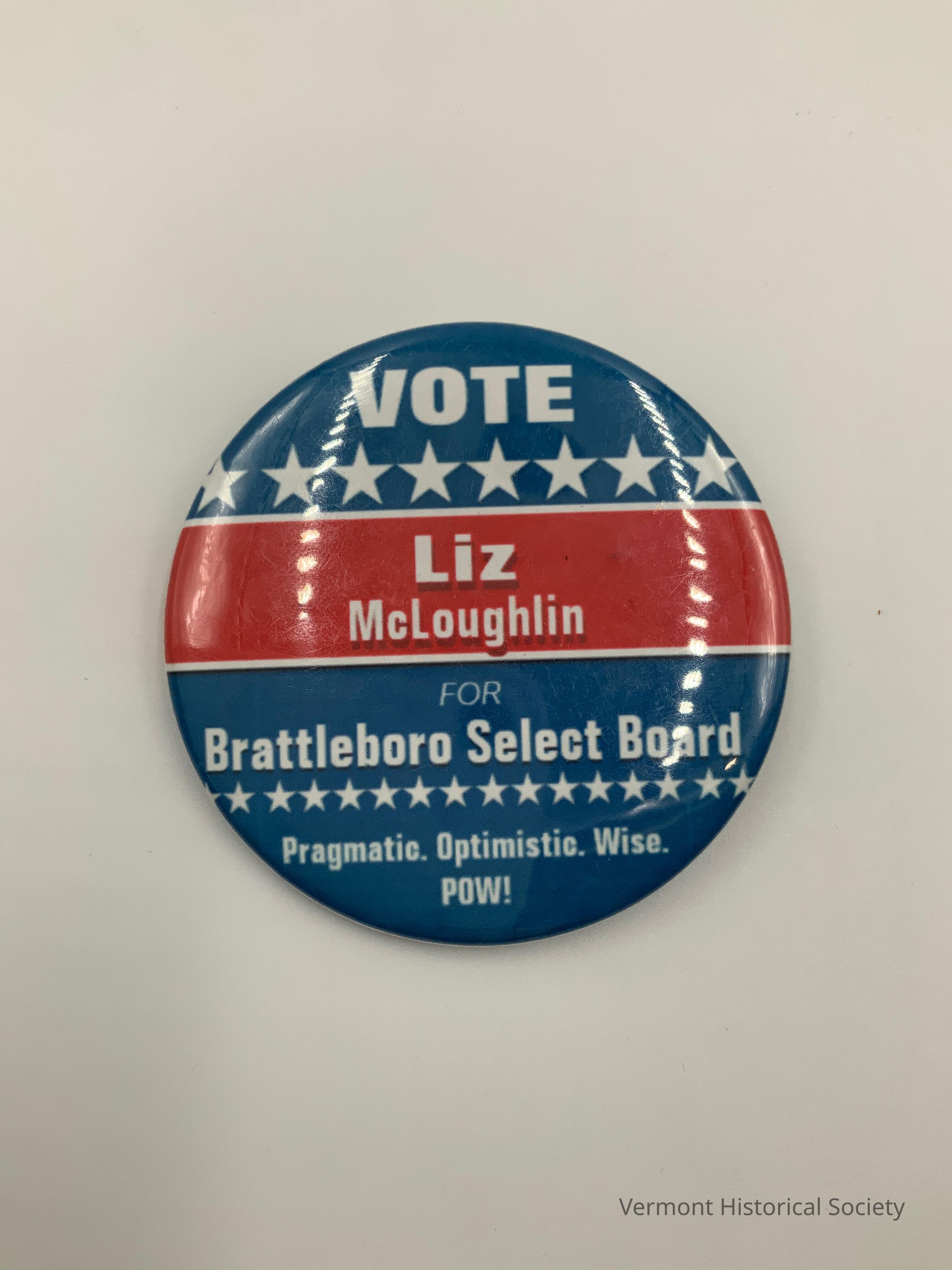 Round metal button with the inscription, "VOTE Liz McLoughlin FOR Brattleboro Select Board Pragmatic. Optimistic. Wise. POW!"