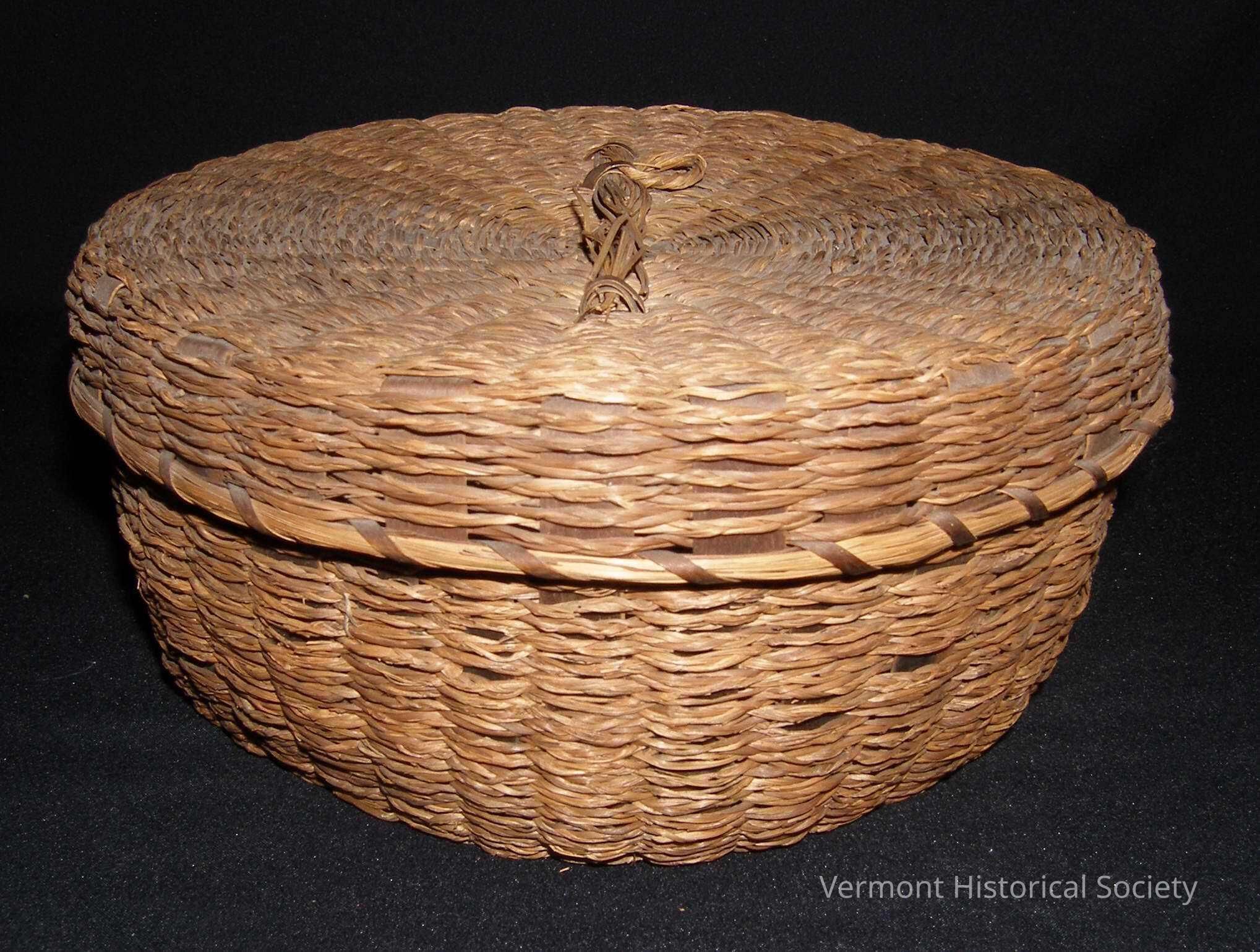 Sweetgrass sewing basket with tatted and crocheted contents. The basket has four interior features: a pincushion with green velveteen dome top (and 4 pins), a thimble holder, a scissors holder and a lidded compartment to store tiny things in (about 1.5" square and .5" deep. This does not appear to have been colored. The magnifying glass has two numbers scratched on it "13" and "3" It has a tiny handle. The rim and handle are a flat grey metal.