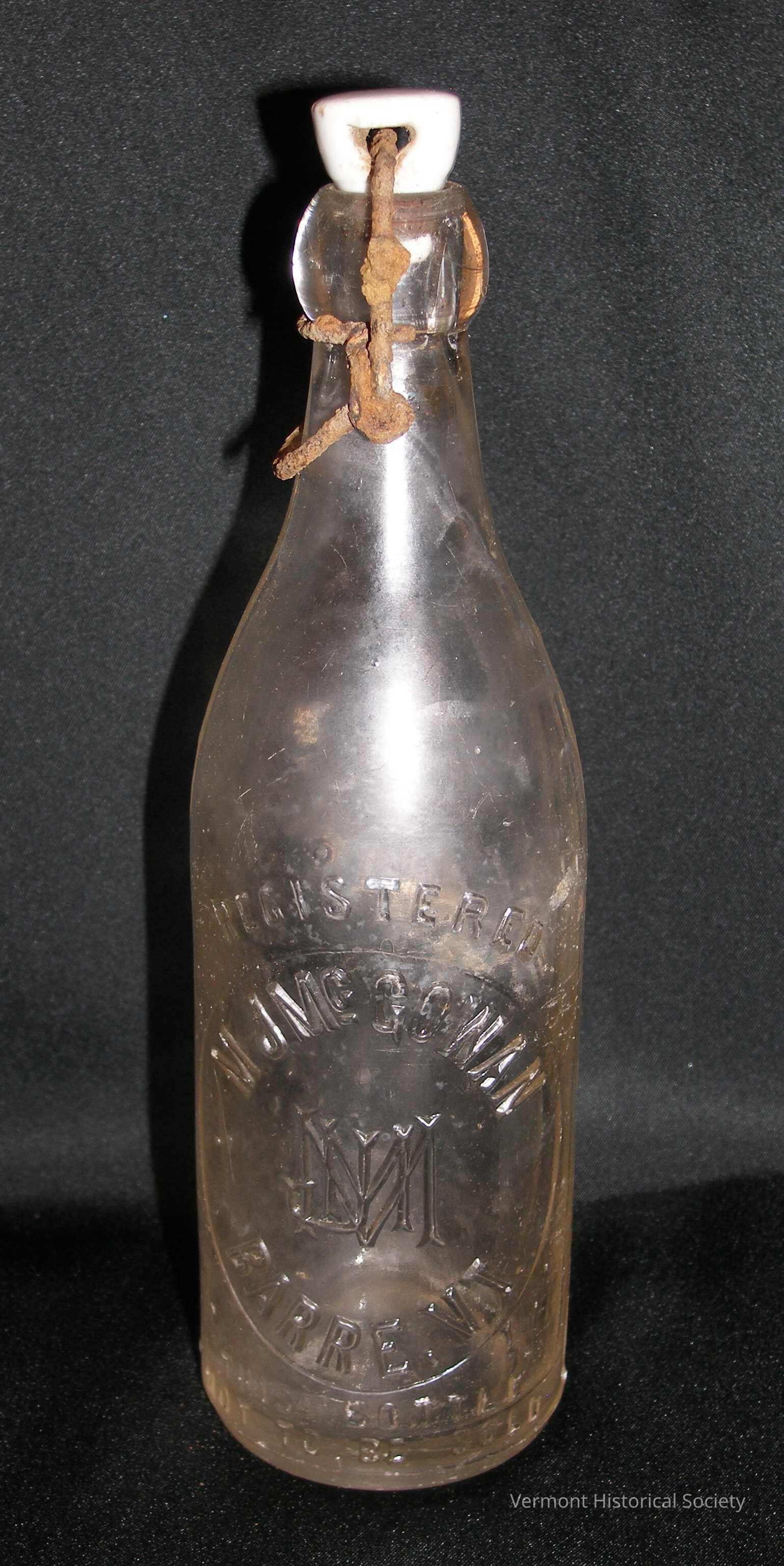Clear glass soda bottle molded with the inscription, “M. J. McCOWAN BARRE, VT." around a decorative monogram of the letters MJM. There is a wire stopper at the top. Around the base of the bottle is the inscription, "THIS BOTTLE NOT TO BE SOLD".Context