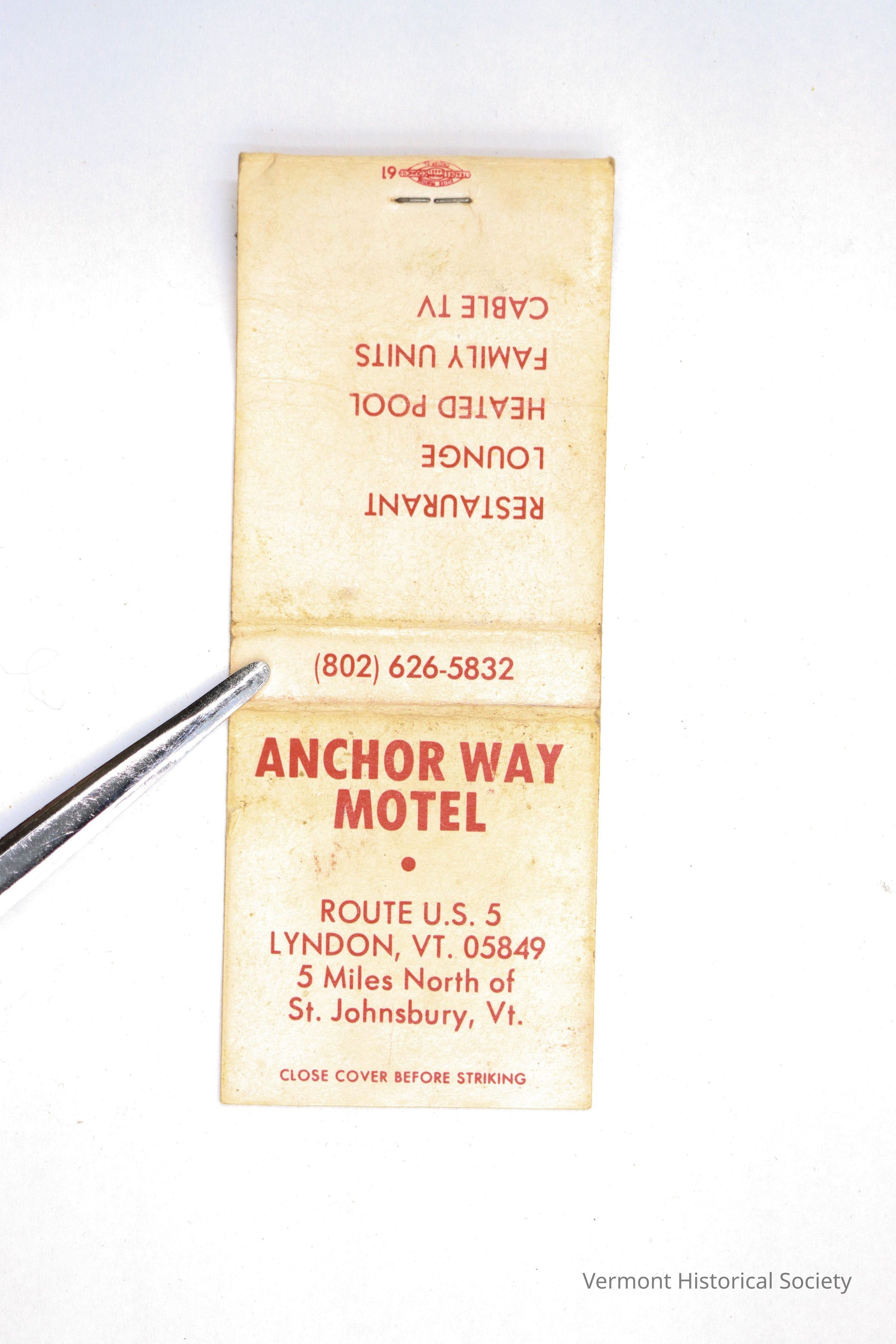 [color] cardboard bifold matchbook. The front flap is printed with the inscription, "ANCHOR WAY MOTEL / ROUTE U.S. 5 LYNDON, VT. 05849 5 Miles North of St. Johsbury, Vt."