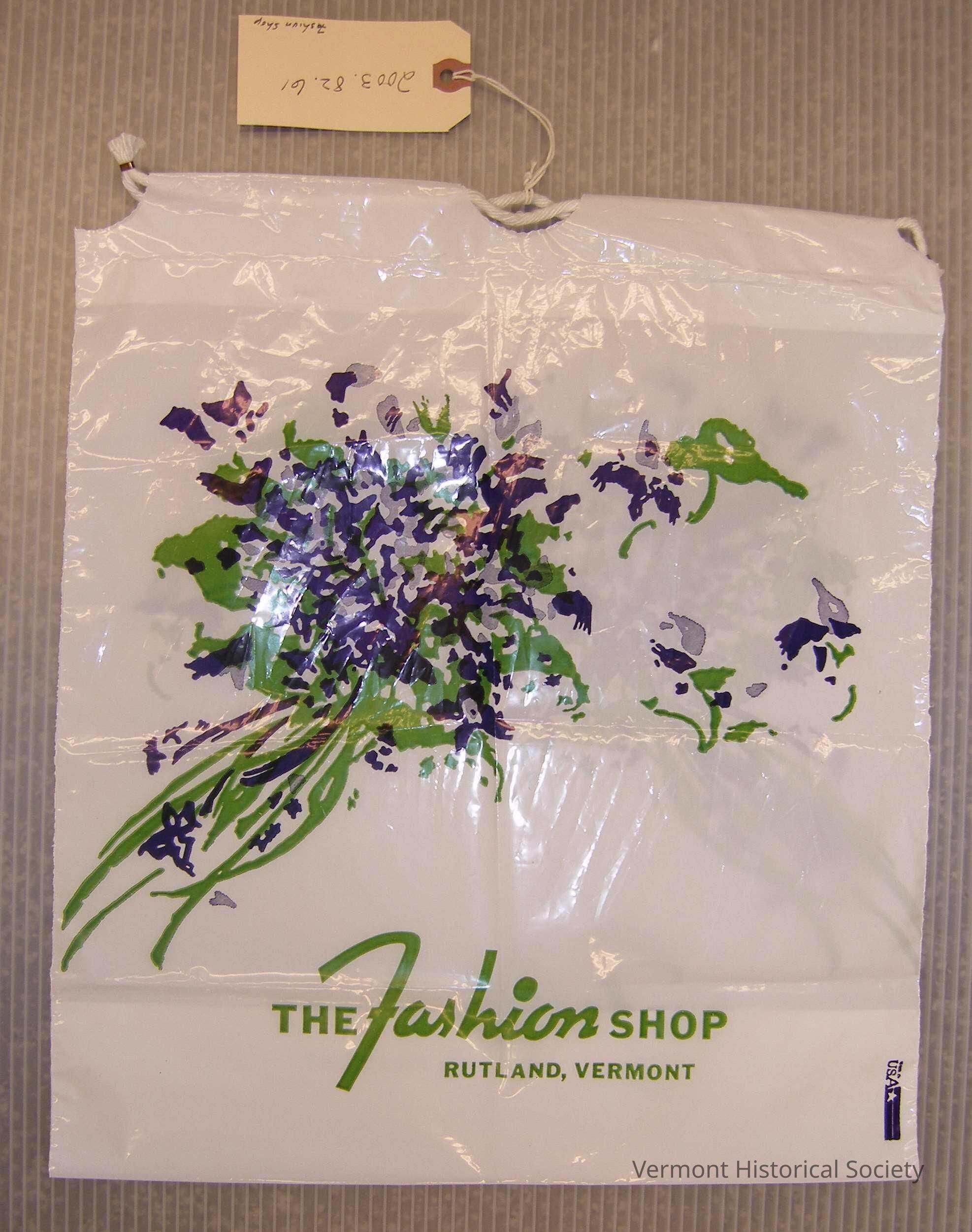 Rectangular white plastic shopping bag with a corded drawstring at the top. Both sides of the bag are printed with an illustration of a floral bouquet with purple blooms and green leaves and stems. The label, "THE Fashion SHOP / RUTLAND, VERMONT", is at the center bottom.Context