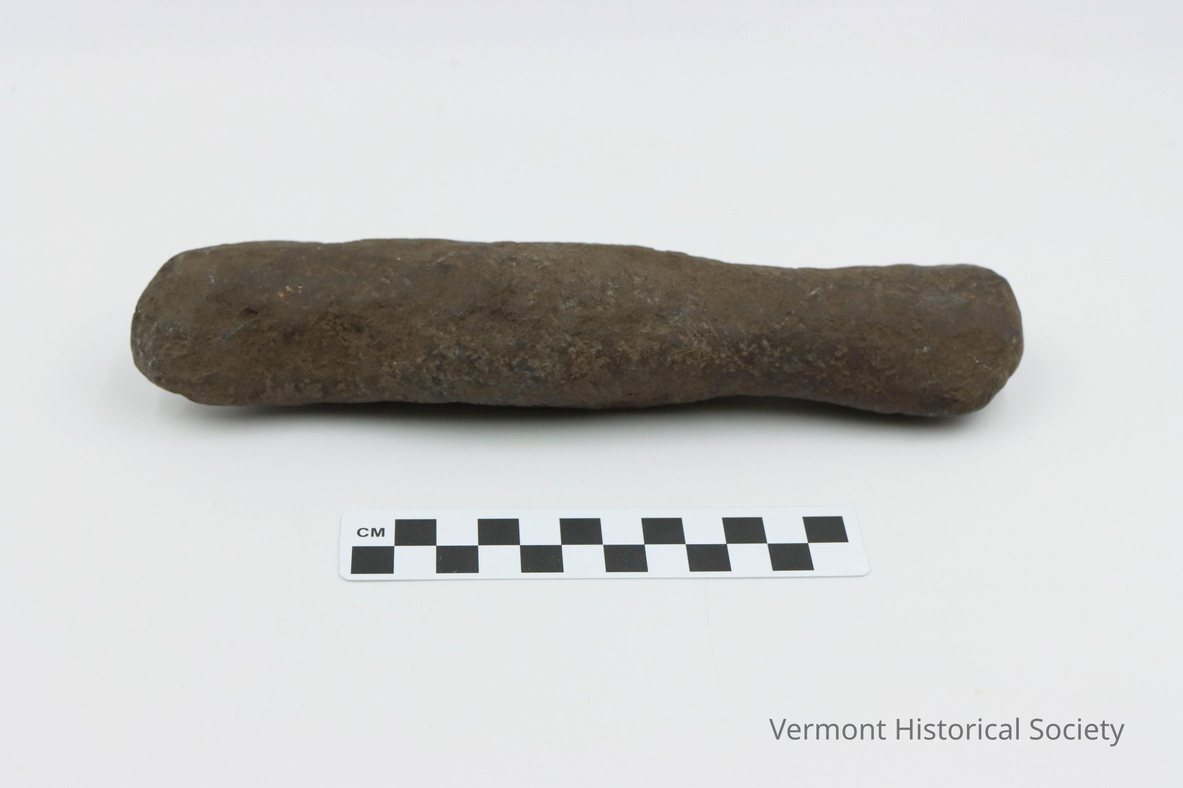 Ground stone abrading stone with a pecked surface. The butt end is rounded and smaller in diameter than the other end, which is ground and polished on one side.Context
