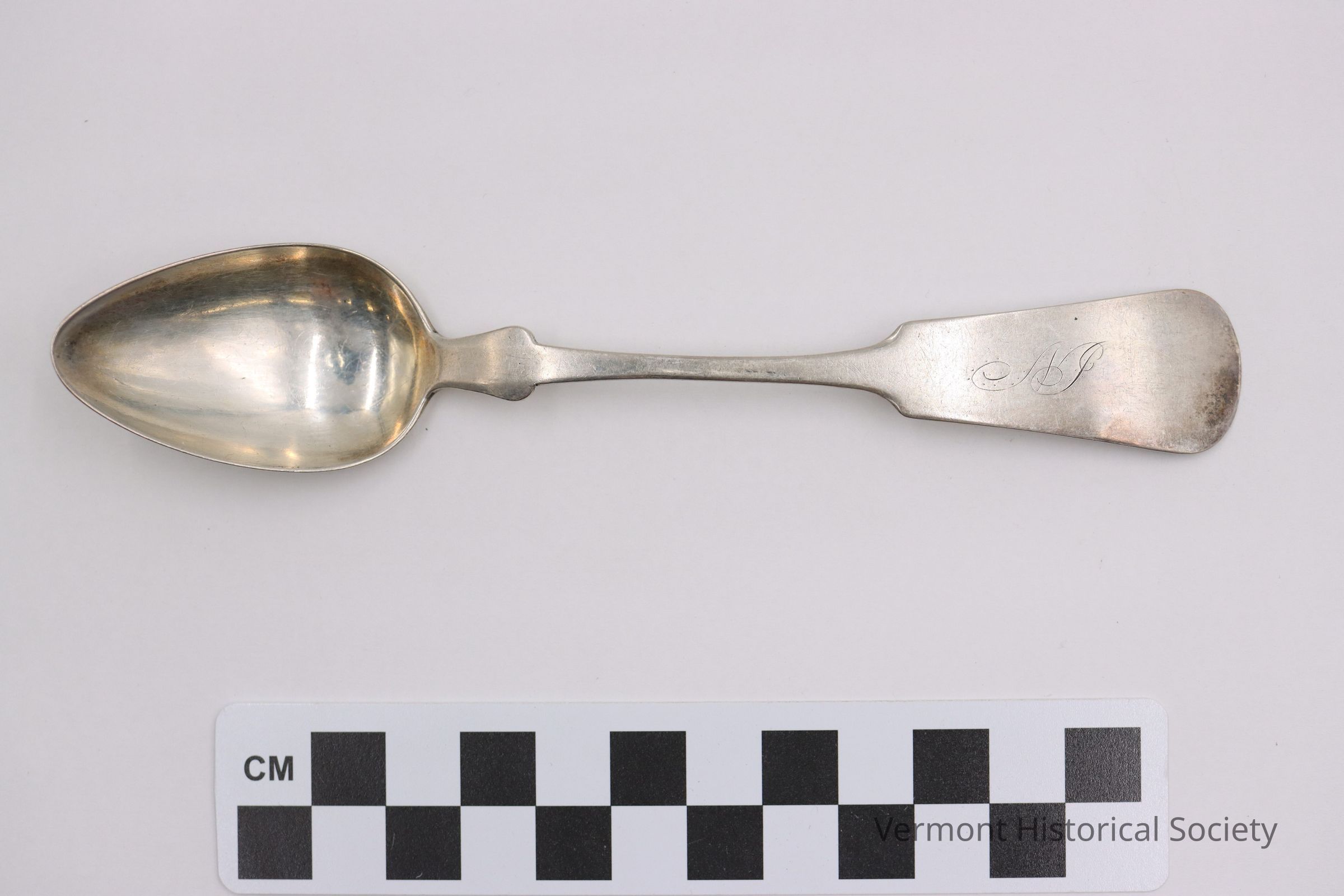 Identical teaspoons, eTeaspoon with a slightly pointed bowl. It has rounded shoulders and a coffin-shaped handle. The front of the handle is engraved with the initials "NJ". The back of the handle is marked, "J.E.BRINSMAID".ach is 6 1/16" long oferall. "NJ" on handles. Made by "J.E. Brinsmaid"