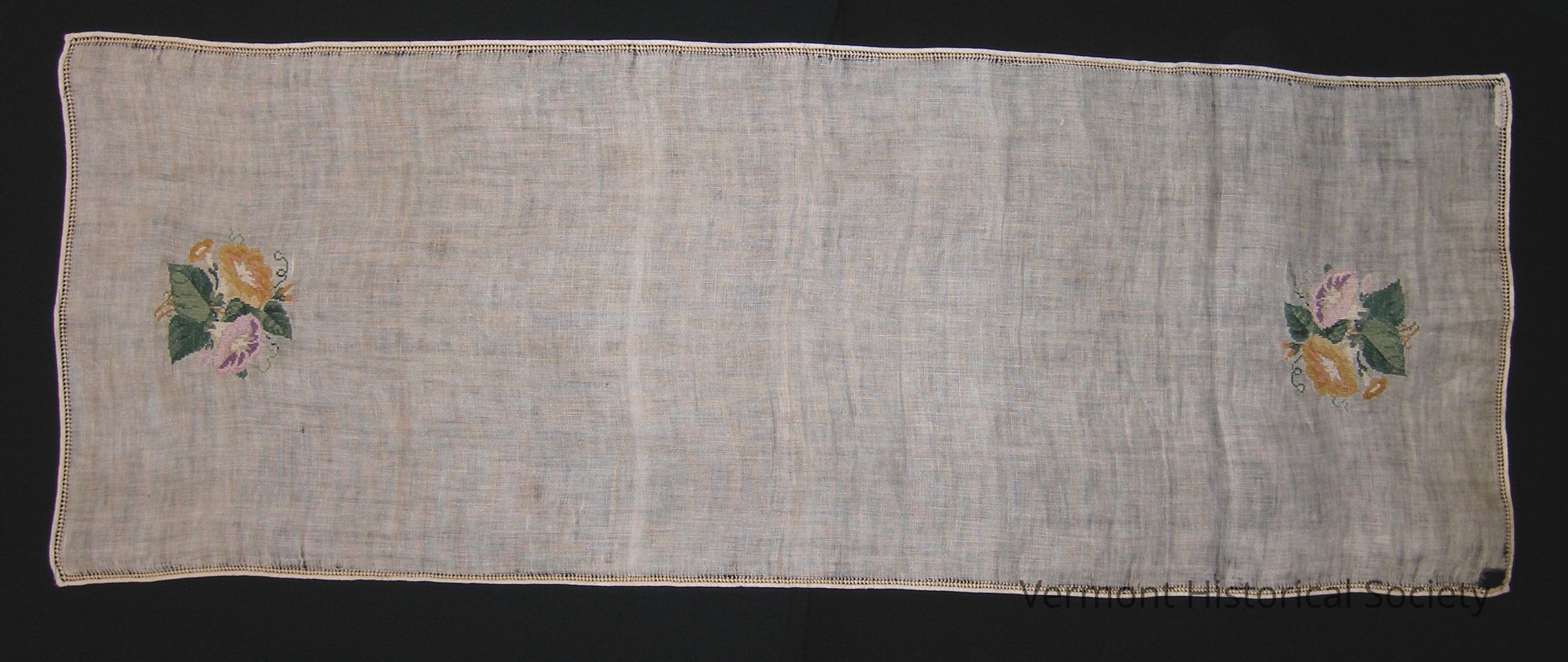 Handwoven and embroidered bureau scarf with floral design at each end, yellow and lavender flowers and green leaves with much detail. Fabric is finely woven linen. Drawn-work border. Donor's name tag in one corner: "Happy Patrick"