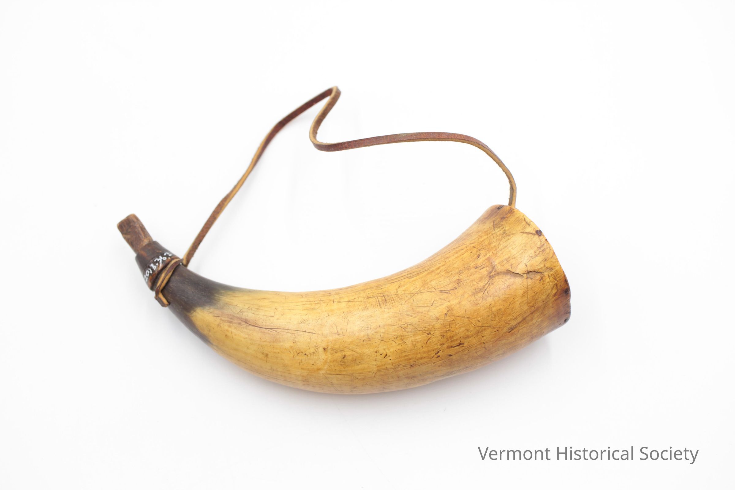 Small, undecorated powder horn with a leather cord attached to both ends. The wide end is plugged with a round block of wood, and the narrow end is plugged with a removable wooden stopper. The name "Wilson" is written in ink on the wooden plug.