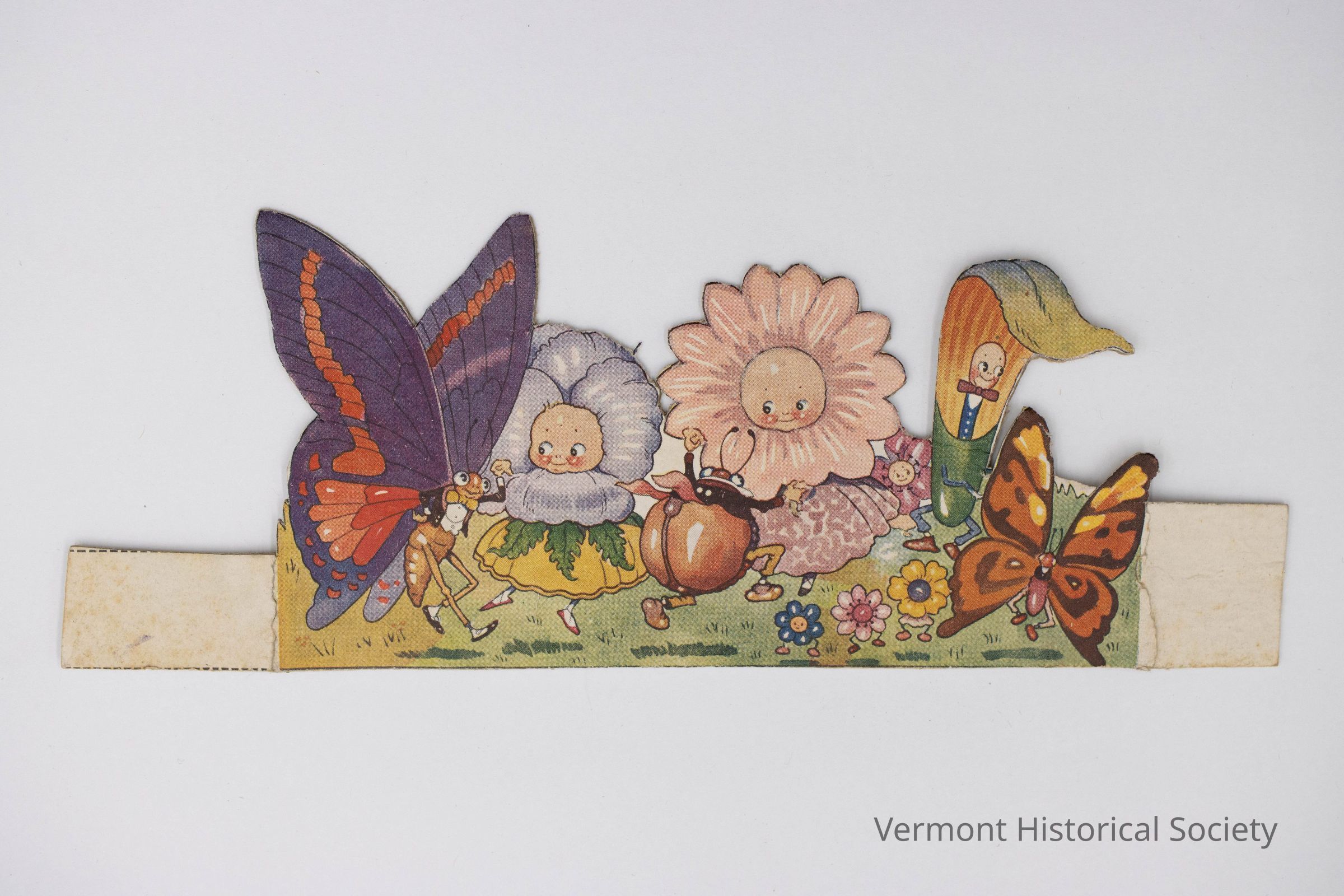 Small, cut-out cardboard standee showing two butterflies, a beetle, several flowers, and a blade of grass dancing together. All the characters are wearing clothes. There are two rectangular extensions on either side of the bottom that fold back to form a base. The back is labeled "Sterling" in pencil, in a child's handwriting.Context