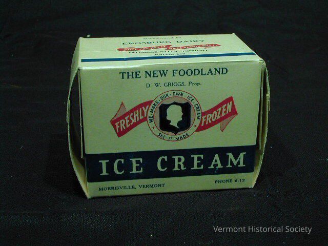 Cardboard ice cream carton. The rectangular carton has a white background and two concentric circles containing a shield with the silhouette of a woman flanked by a ribbon decoration on either side in the center of the carton. The black text at the top of the carton says “THE NEW FOODLAND / D. W. GRIGGS, Prep.” The pink ribbon has “FRESHLY FROZEN” superimposed in white print and the black printed words “WE MAKE OUR OWN ICE CREAM / SEE IT MADE” are between the two concentric circles. A solid black band is at the bottom of the carton and the words “ICE CREAM” are printed. Below this band, “MORRISVILLE, VERMONT / PHONE 6.12” is in black print. The sides are folded and adhered to one another.Acquisition
