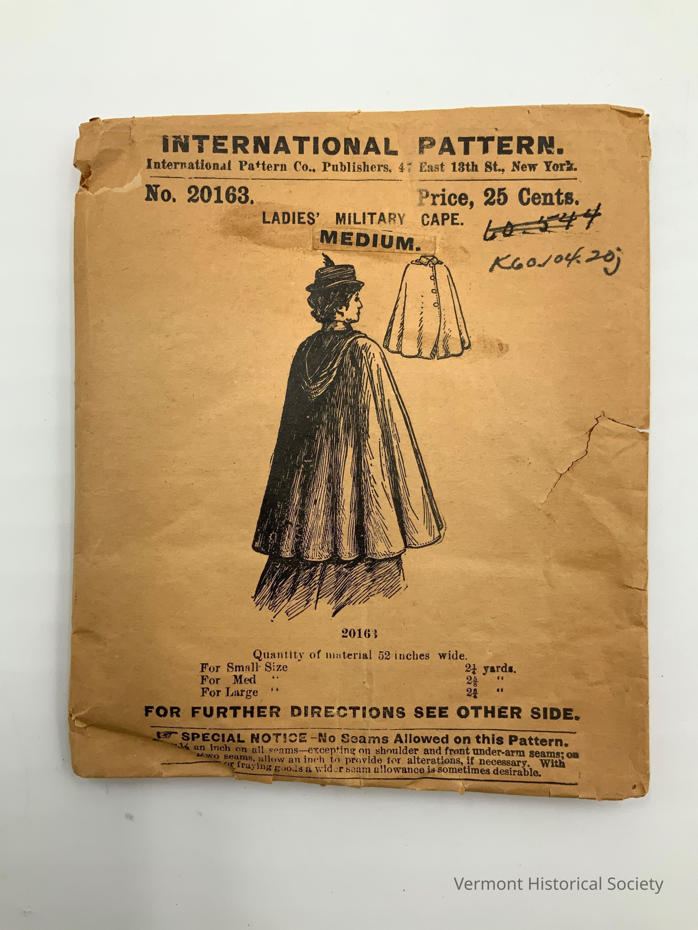 Cut tissue paper sewing pattern in a commercial envelope. The front of the envelope is printed with brand information ("INTERNATIONAL PATTERN"), sewing instructions, and an illustration of the finished garment. The garment is a thigh-length full cut cape with a hood ("Ladies' Military Cape").