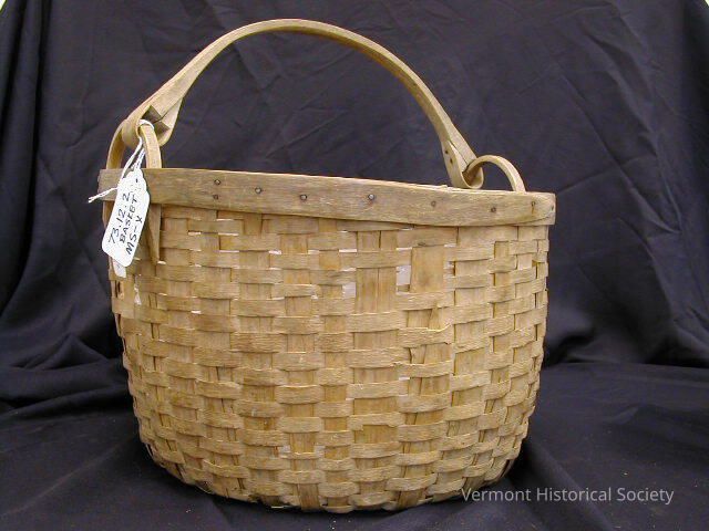 Half bushel basket made of brown ash splint. The basket has a wooden handle that can swivel on two u-shaped wooden pieces.Use