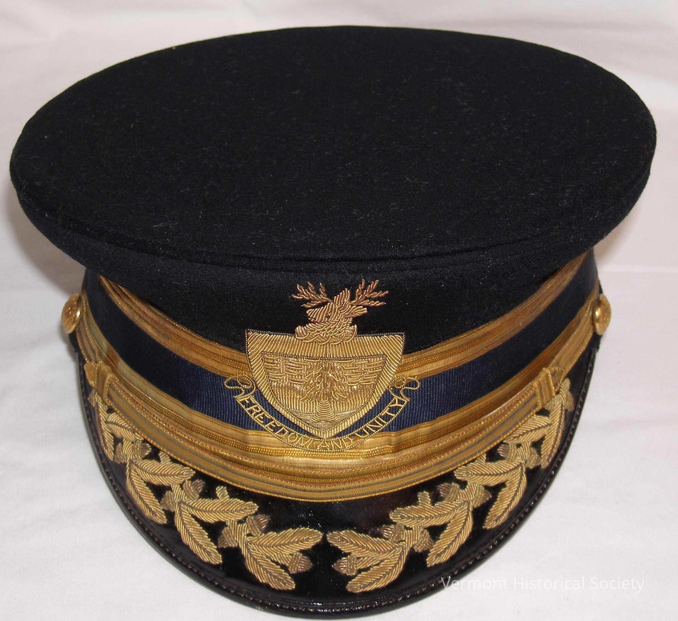 This service cap has a stiff and round crown of navy blue wool. The center front is embroidered in gold with the seal of the State of Vermont and the motto, "Freedom and Unity". The short black brim is embroidered with oak leaves. On either side of the cap, there are brass buttons, and a gold band runs between them. The inside of the crown is labeled, "The M.C. Lilley & Co. Columbus, Ohio Manufacturers of Military and Society Goods". There is a paper sticker on the band that reads, "7 1/8", indicating the hat's size.Context