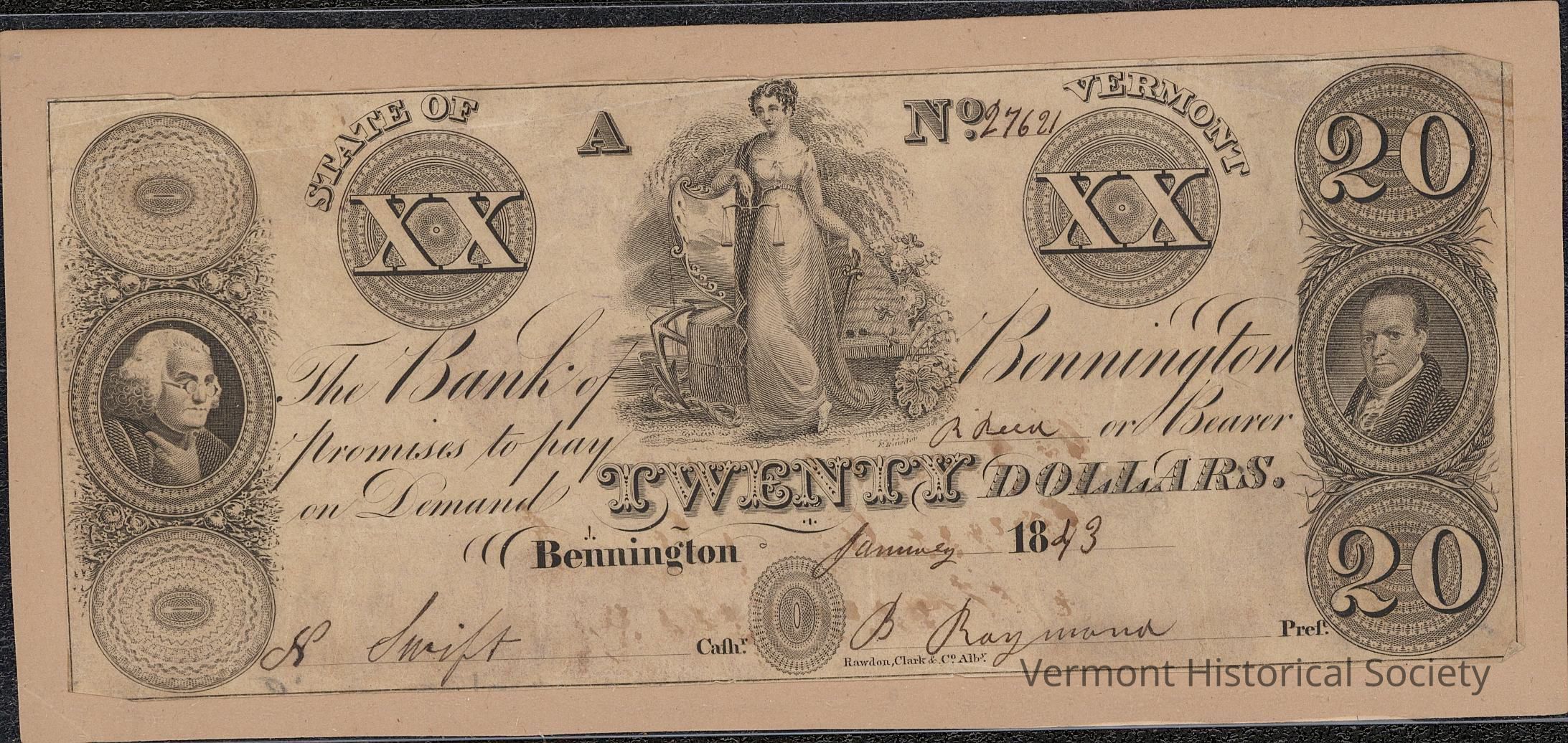 Private bank note for 20 dollars from The Bank of Bennington in Bennington, Vermont. It is signed by N. Swift (cashier) and B. Raymond (president). The serial number is 27621. It is dated January 1843. It is made out to R. Reed. It is pasted onto a rectangular piece of cardboard.
