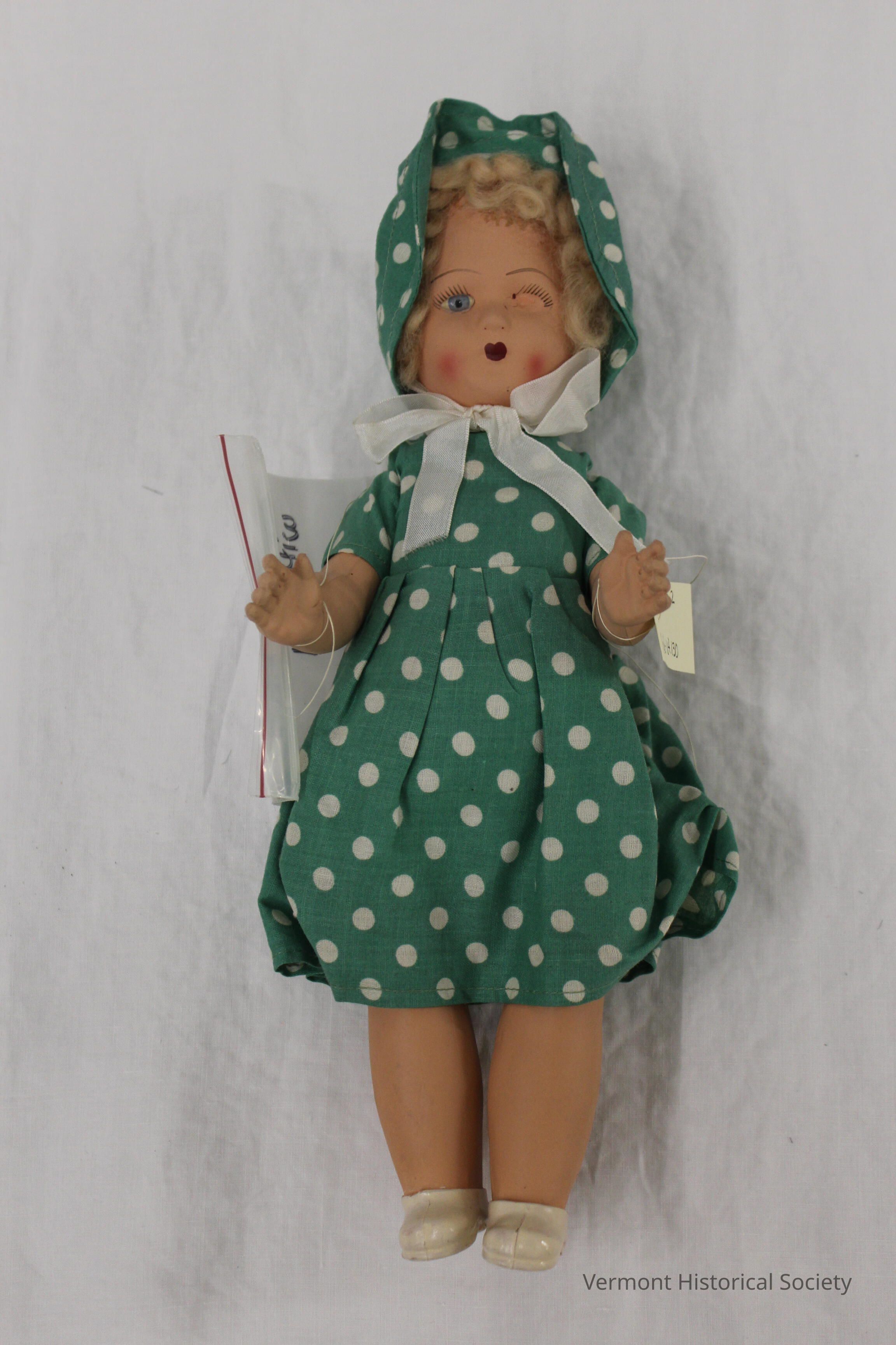 Doll in a green and white dot cotton dress with matching bonnet. Doll has blond hair and moveable arms and legs. One eye is missing but is bagged with the doll.Context