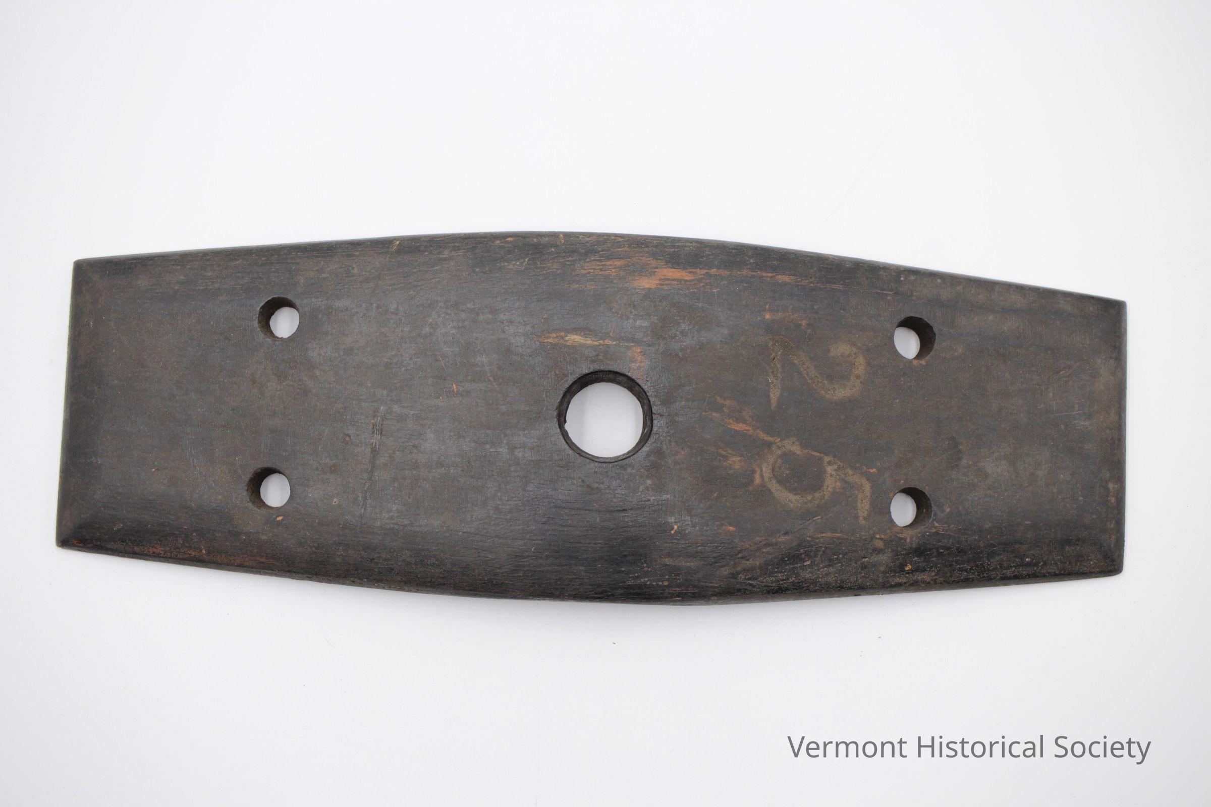 Semi-rectangular wooden pattern drilled with 5 holes. The number 25 is written on one side.