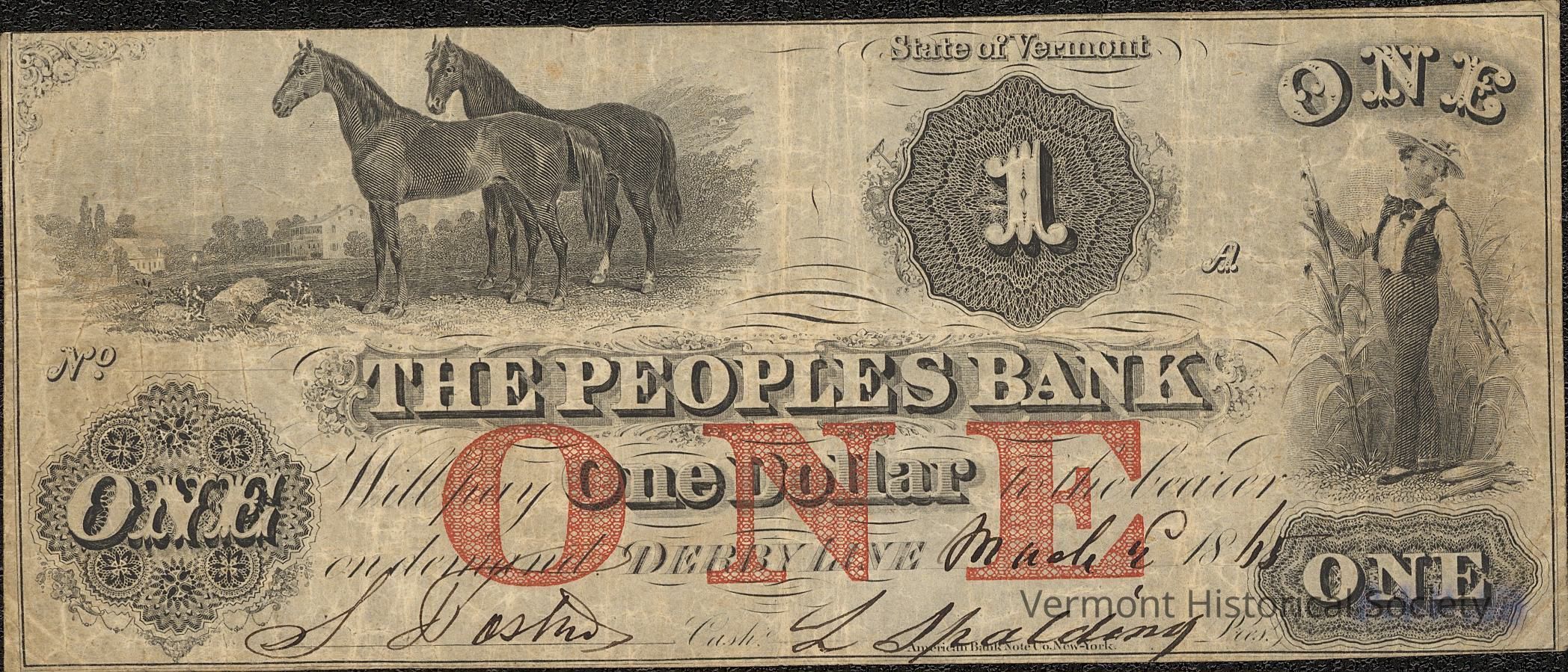 Private bank note for 1 dollar from The Peoples Bank in Derby Line, Vermont. The serial number is not filled out. It is dated March 2, 1865. It is signed by S. Fashid and L. Spalding.