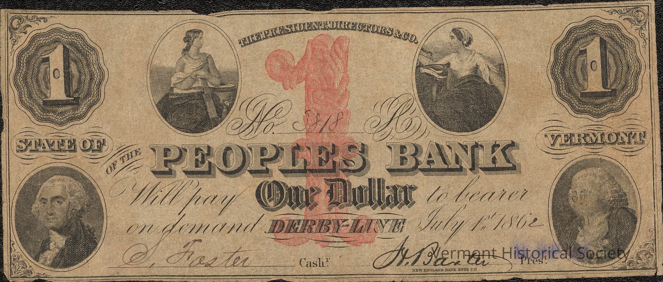 Private bank note for 1 dollar from The Peoples Bank in Derby Line, Vermont. The serial number is 3818. It is dated July 1st, 1862. It is signed by S. Foster and H Baxter.