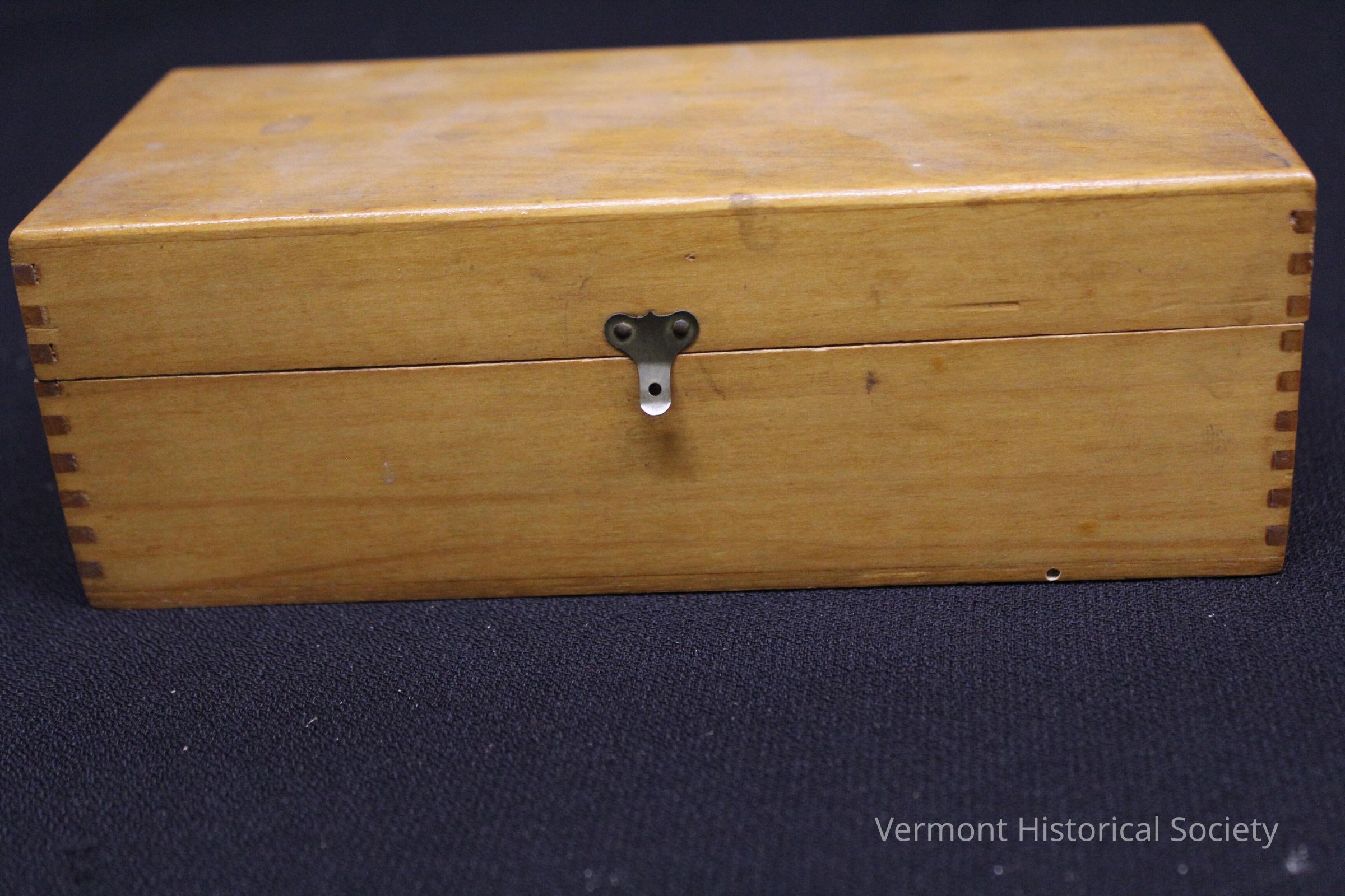 Wooden box with finger-jointed corners. The box has a lid that hinges upward at the back with two small, metal hinges. There is a metal clasp at the center front, attached to the lid. The interior of the box is unfinished.Context