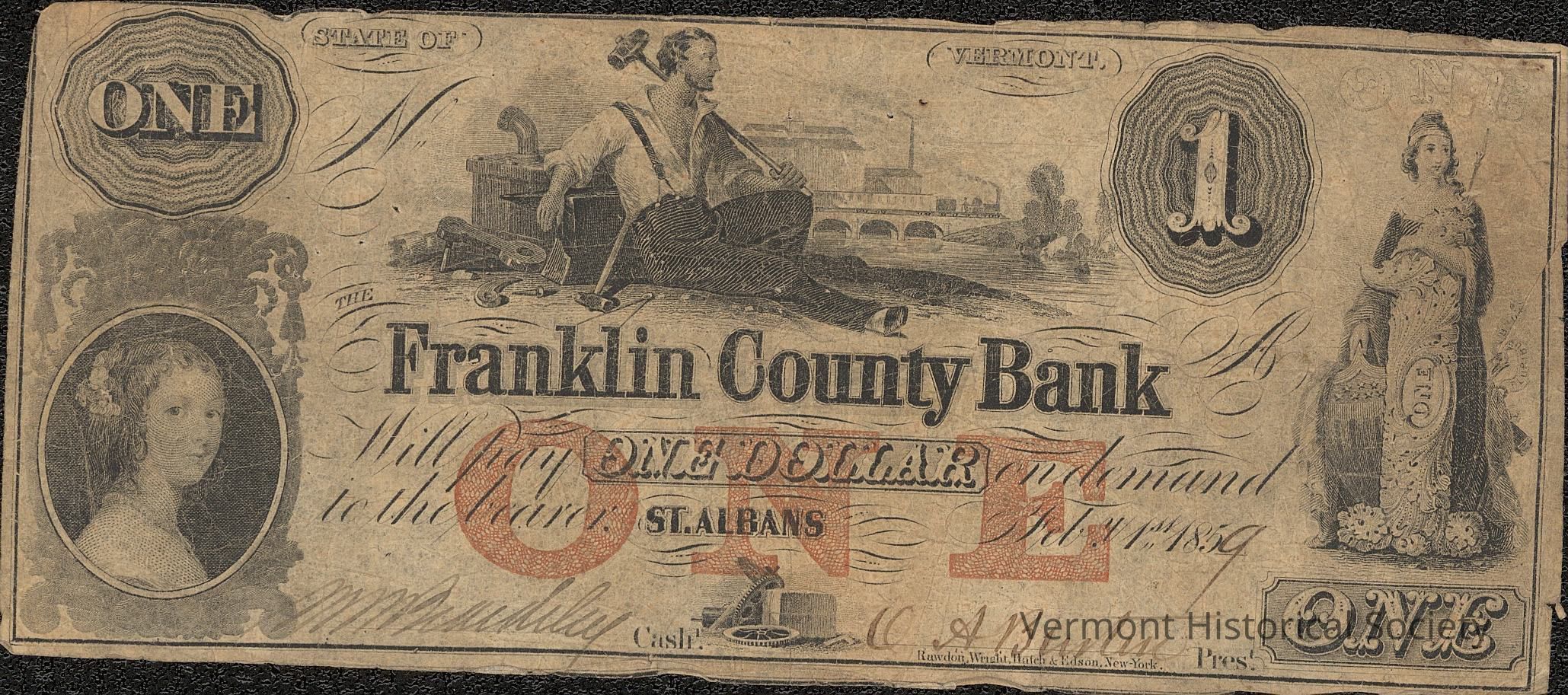 Private bank note for 1 dollar from The Franklin County Bank in St. Albans, Vermont. It is dated Feb. 1st, 1859.