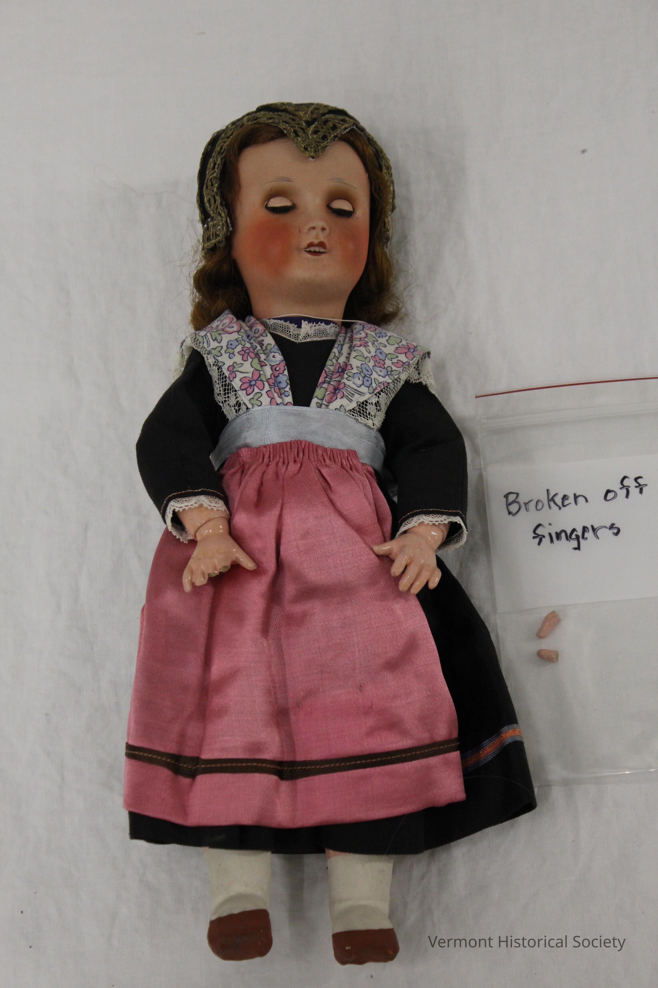 Doll in black dress with blue and pink trim, pink apron, flowered and lace straps. Brown hair which is loose from the head, gold filigree on black cap. Two broken fingers in bag.Context