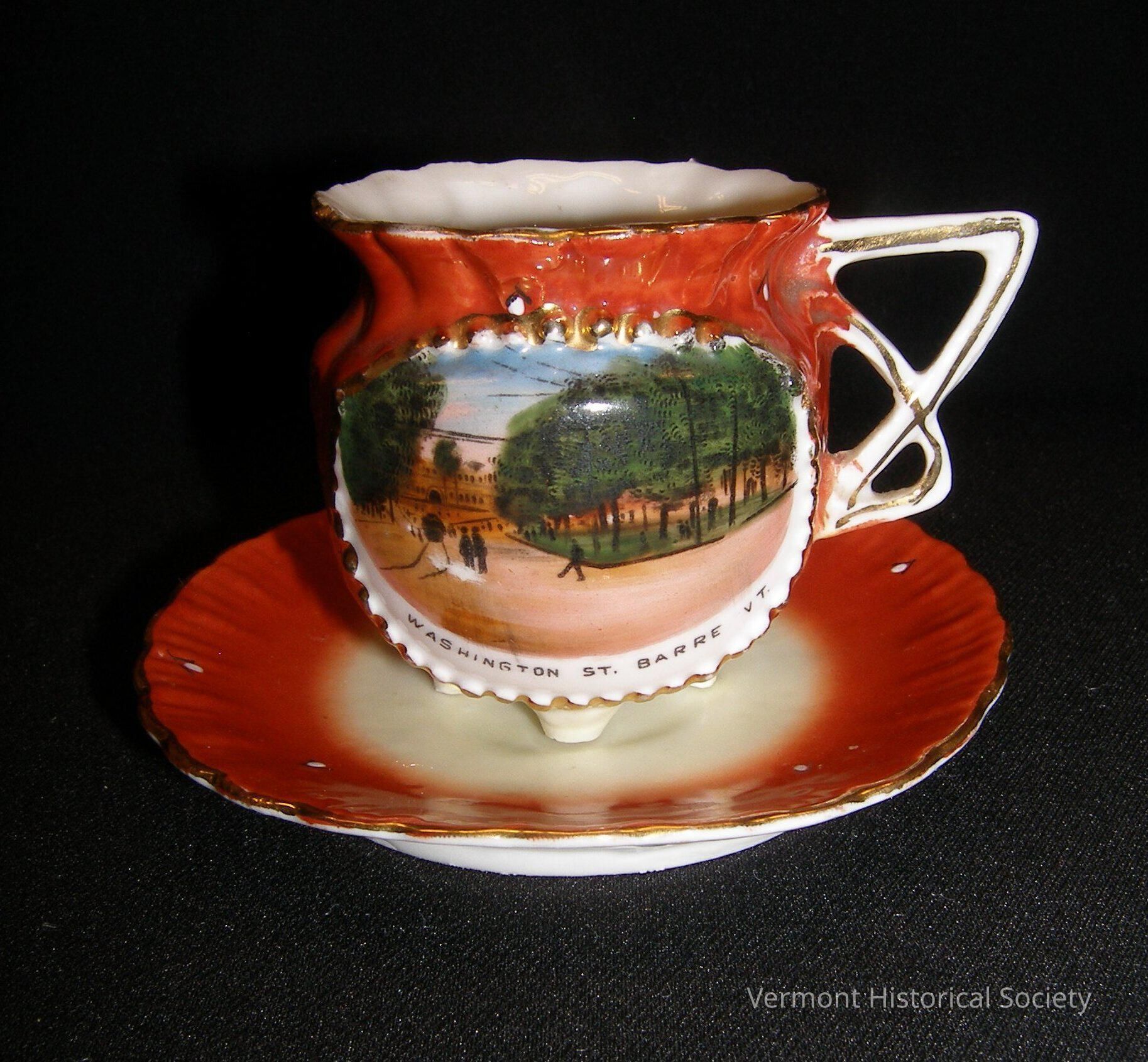 Cauldron-shaped demitasse cup with four feet. The handle consists of two ceramic triangles intersecting with each other. One side is printed with an illustration of a park bordered by a road. The image is labeled, "WASHINGTON ST. BARRE VT." The bottom of the cup is marked, "869". The cup is painted red with white and black spots, resembling seeds.