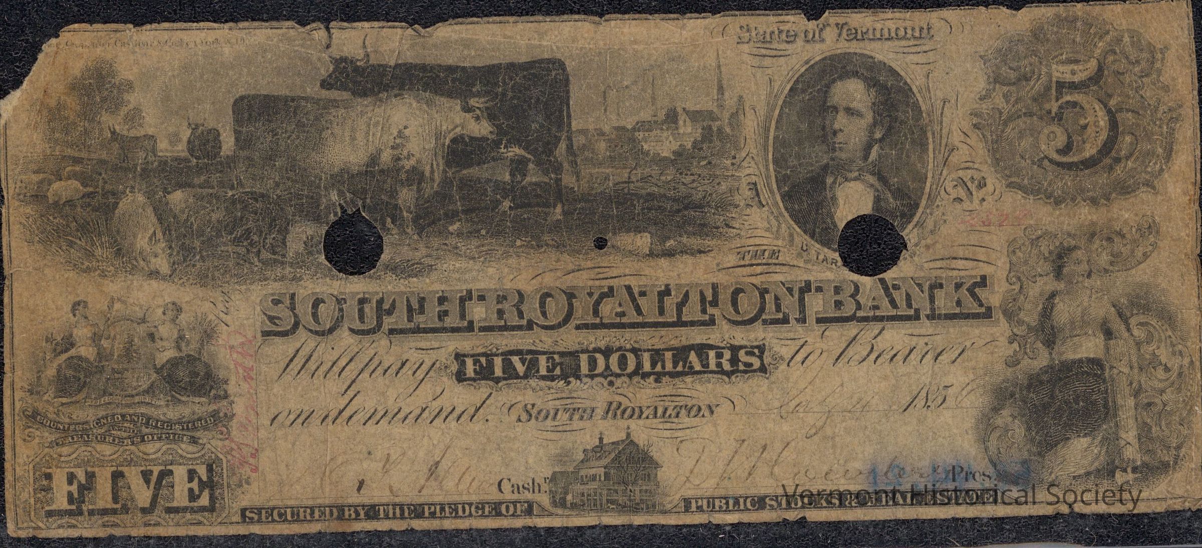Private bank note for 5 dollars from The South Royalton Bank. It is dated July 4, 1856. There are 2 large holes and 1 small hole along a line in the center of the bill.