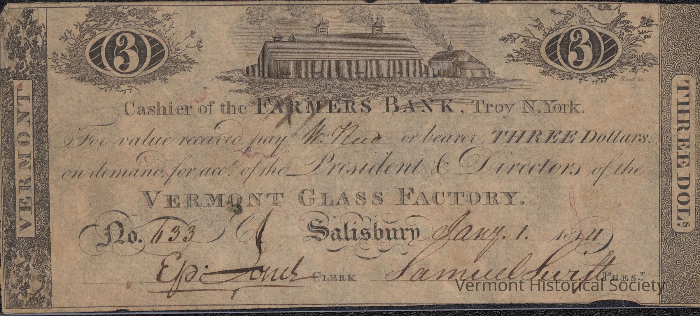 Private bank note for 3 dollars from the Farmers Bank in Troy, New York. It is made out to W. Reed (or bearer), to be paid from the account of the Vermont Glass Factory of Salisbury, Vermont. The serial number is 633C. It is dated January 1, 1814. It is signed by Ep: Jones (cleark) and Samuel Swift (president).