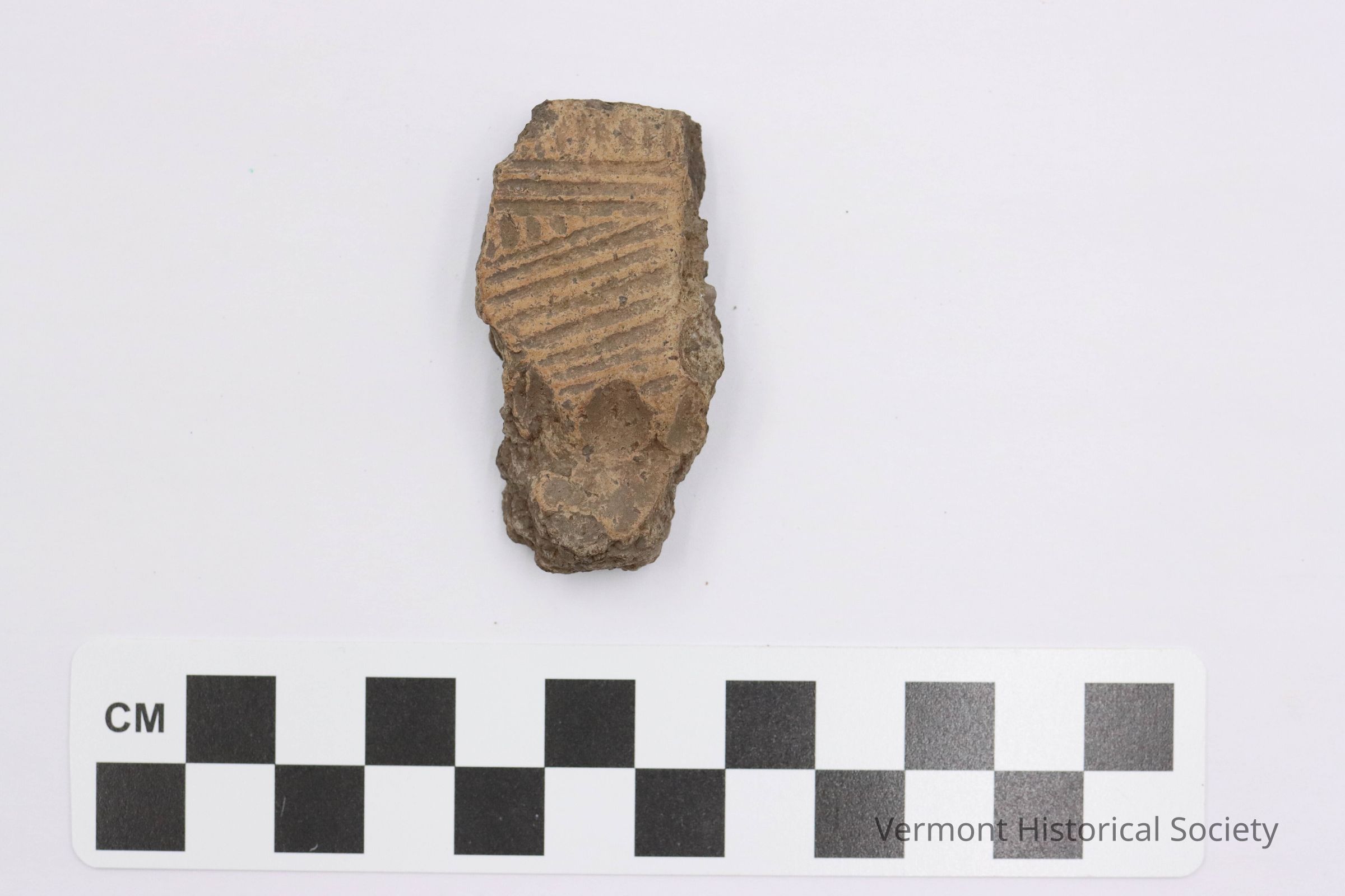 Pottery rim sherd decorated with incised lines. A row of vertical lines is at the edge, followed by three horizontal lines, then an area of oblique lines. A small section at the left shows that the oblique lines alternate in sections.Context