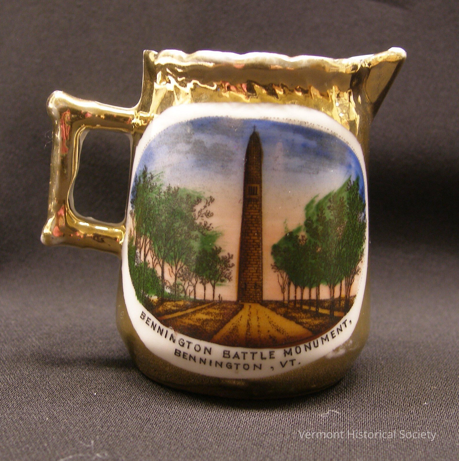 Gold-lustered cream pitcher with a full-color illustration of a tall obelisk. The illustration is labeled, "BENNINGTON BATTLE MONUMENT, BENNINGTON, VT." The bottom of the pitcher is marked, "MADE IN GERMANY FOR Harry Willoughby Bennington, Vt."