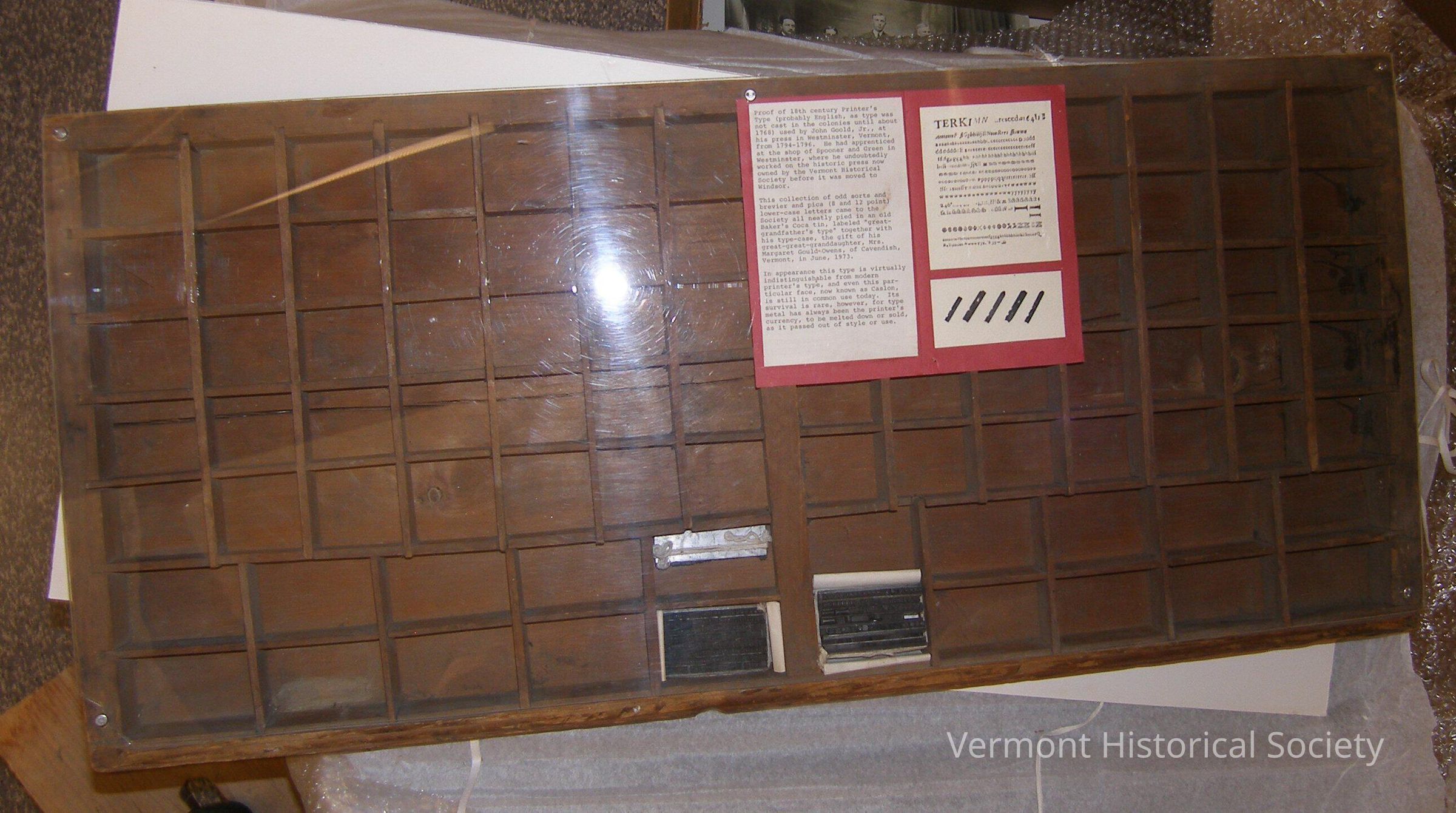 Handmade wooden type case. The case is divided in half then subdivided into small boxes or cubbies. Five rows are separated into square boxes (7 in each half-length row), and the remaining two are separated into rectangular boxes (5 in each half-length row). The reverse bears the inscription, "Type board used by John Goold in printing the first newspaper ever printed in the state of Vermont. John Goold was the father of Lydia Goold Putnam and grandfather of Abel Putnam (Jr?)." The front of the case is covered in plexiglass with an exhibition label and an example of the print attached.
