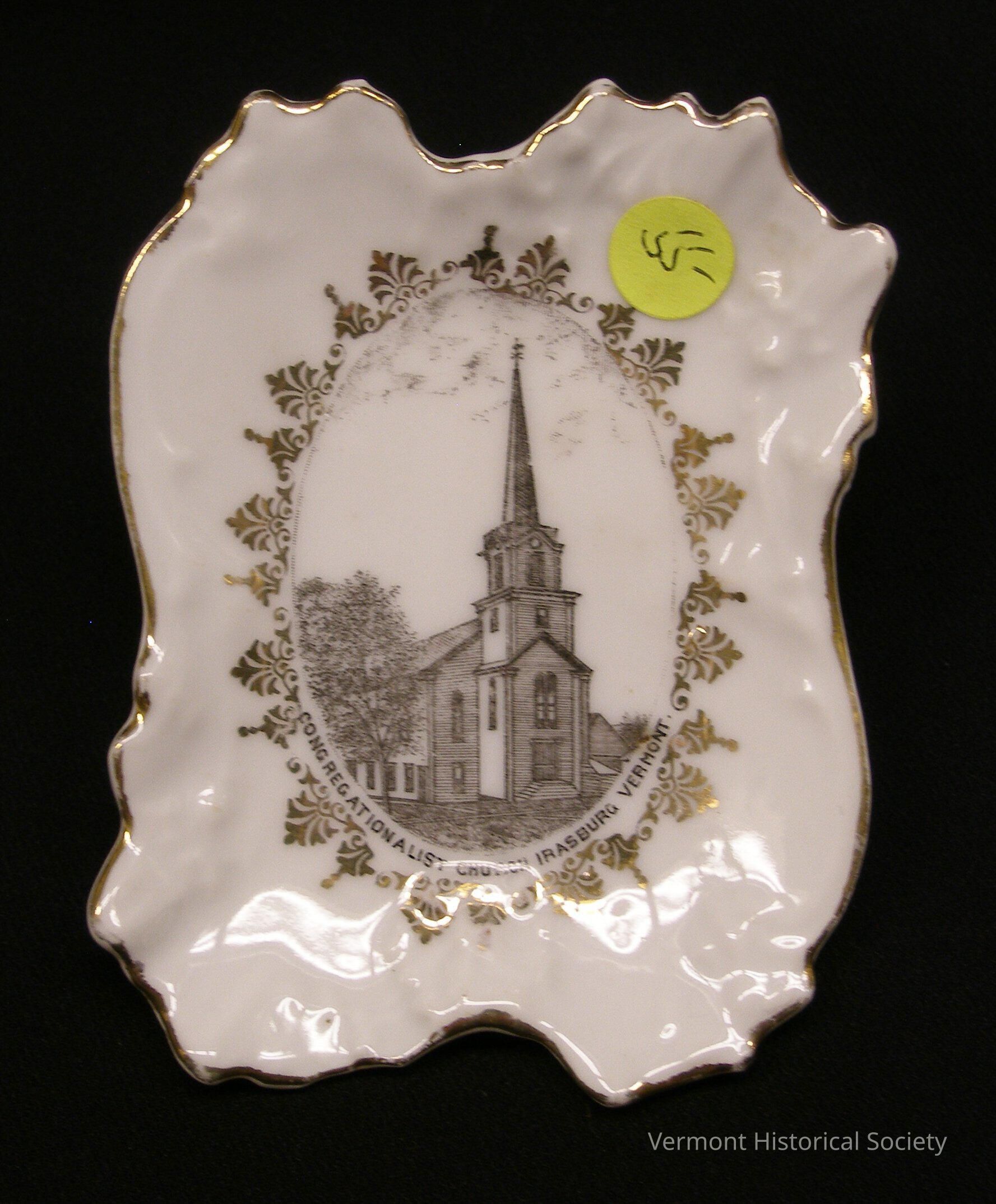 Rectangular card receiving tray with rococo feathered edges. The edges are lined with gilding. The center is printed with an engraved illustration of a clapboard church building with a tall, central steeple. The image is labeled, "CONGREGATIONALIST CHURCH IRASBURG, VERMONT." The reverse is marked, "Made in Austria for F. H. Buchanan Irasburg, Vt."