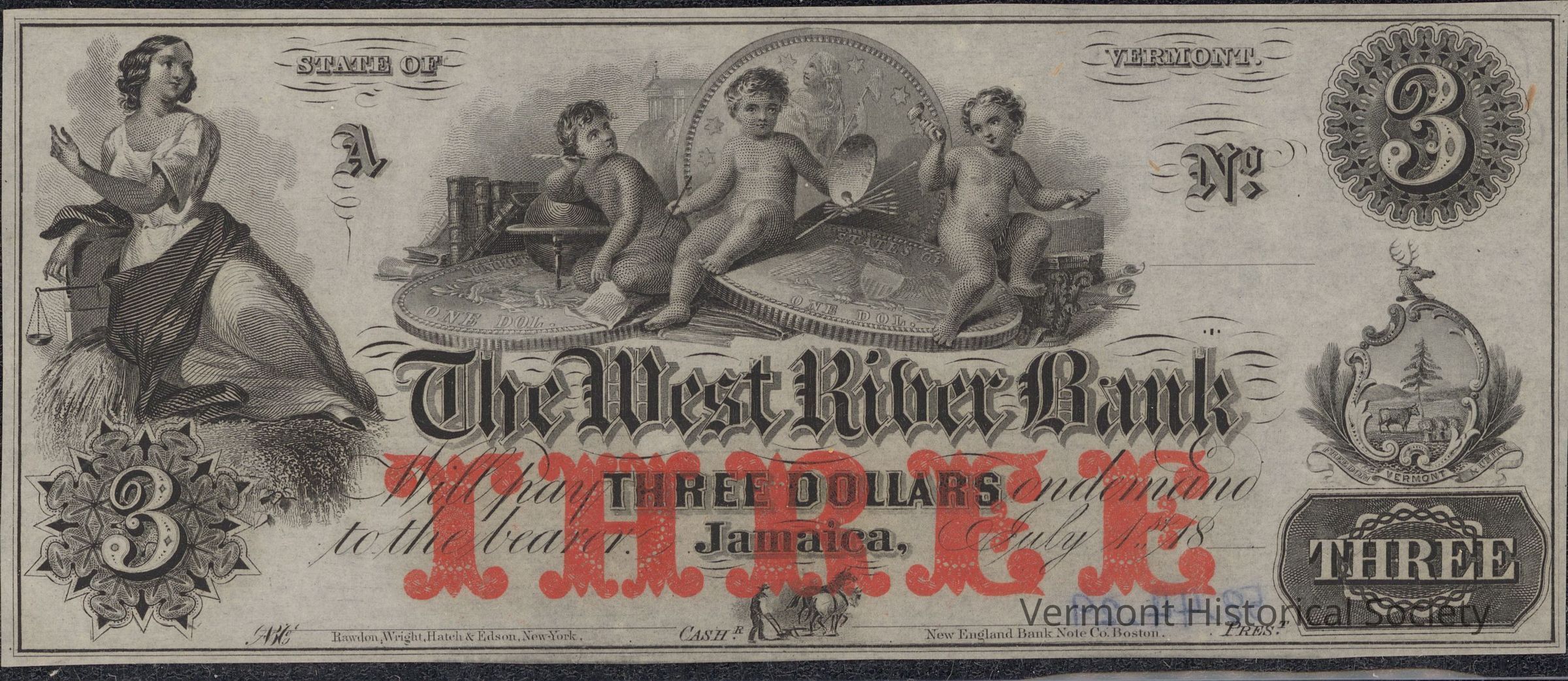 Private bank note for 3 dollars from The West River Bank in Jamaica, Vermont. It is dated July 1st, 18[blank]. It is unfilled and unsigned.