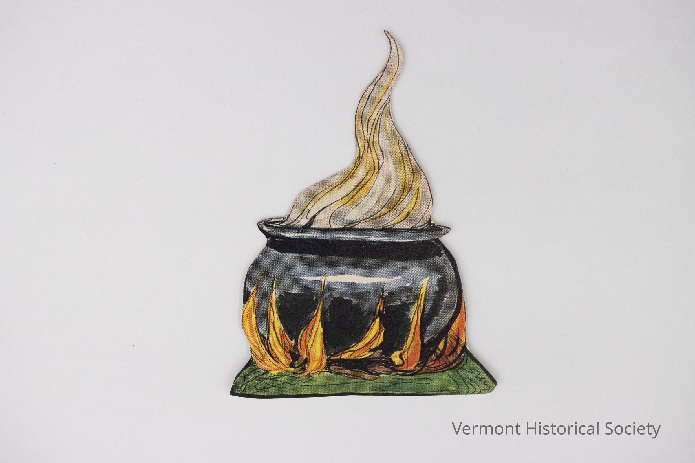 Printed paper doll accessory in the shape of a caldron sitting over a fire. A whisp of smoke rises from the pot's interior. The back shows a portion of a sales catalog page.Context
