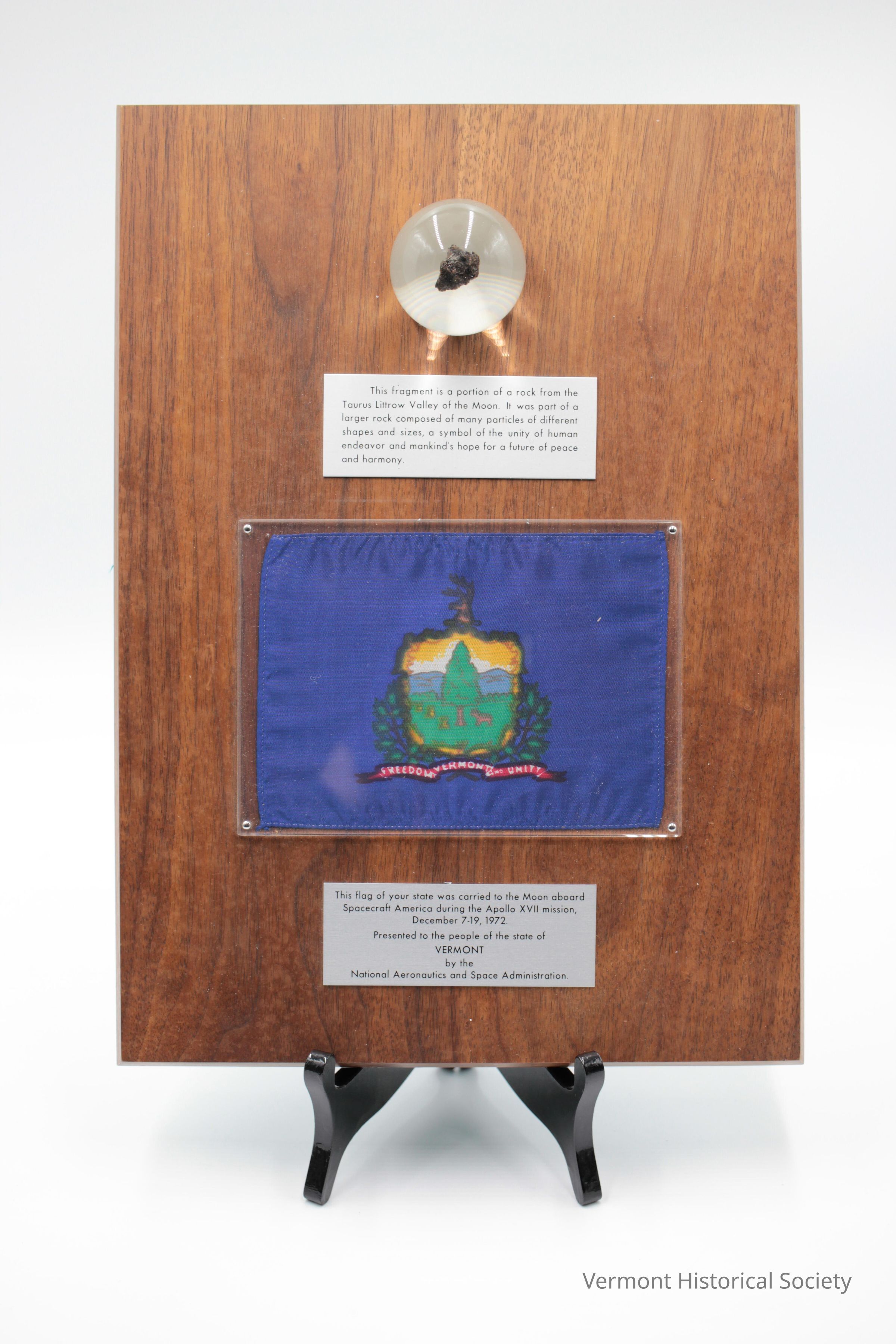 Wooden plaque with a small flag and rock mounted on the front. The rock is encased within a resin dome. A small metal label beneath the rock reads, "This fragment is a portion of a rock from the Taurus Littrow Valley of the Moon." It was part of a larger rock composed of many particles of different shapes and sizes, a symbol of the unity of human endeavor and mankind's hope for a future of peace and harmony." Beneath the label is a small Vermont state flag mounted beneath a clear plexiglass frame. Beneath the flag is a small label that reads, "This flag of your state was carried to the Moon aboard Spacecraft America during the Apollo XVII mission, December 7-19, 1972. Presented to the people of the state of Vermont by the National Aeronautics and Space Administration."