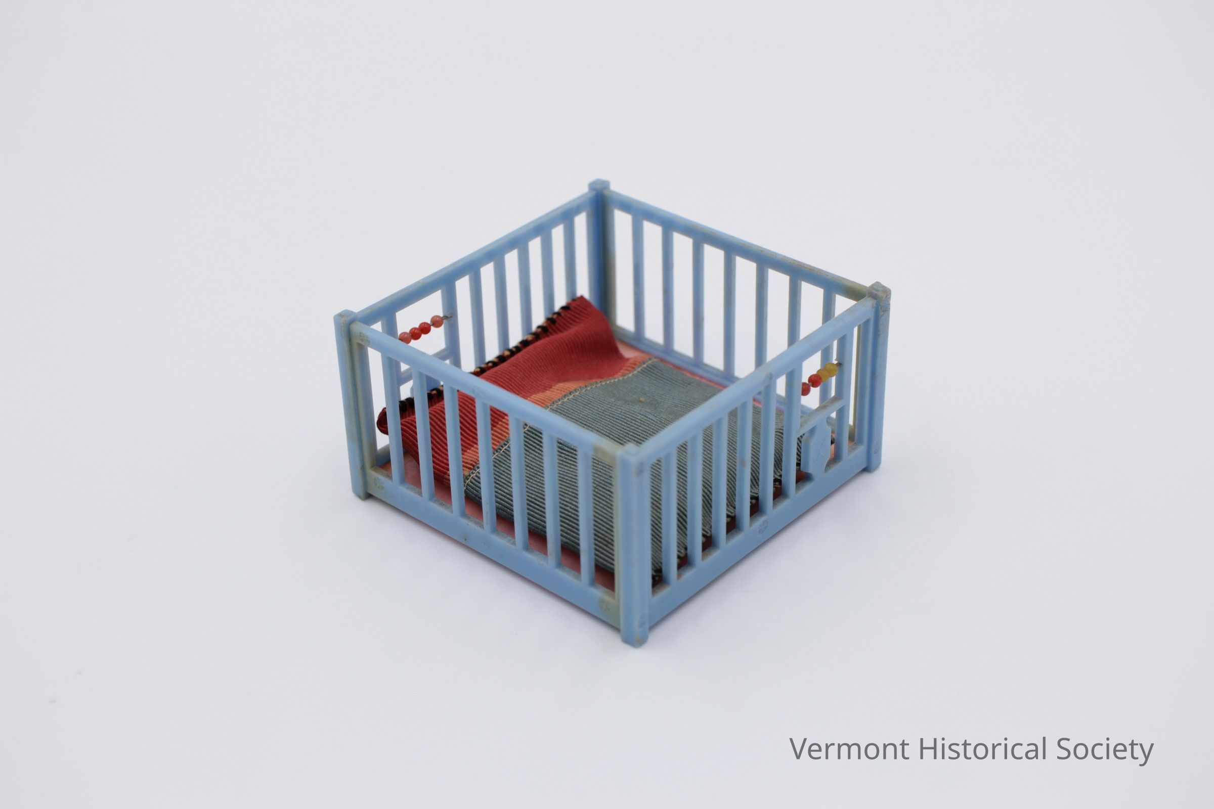 Miniature plastic playpen sized for a dollhouse. The sides of the pen consist of vertical bars made of blue plastic. Two sides have square openings with a horizontal line of glass beads. The base is made of pink plastic. There is a cushion inside the pen made from two grosgrain ribbons machine stitched together and whip stitched closed.Context