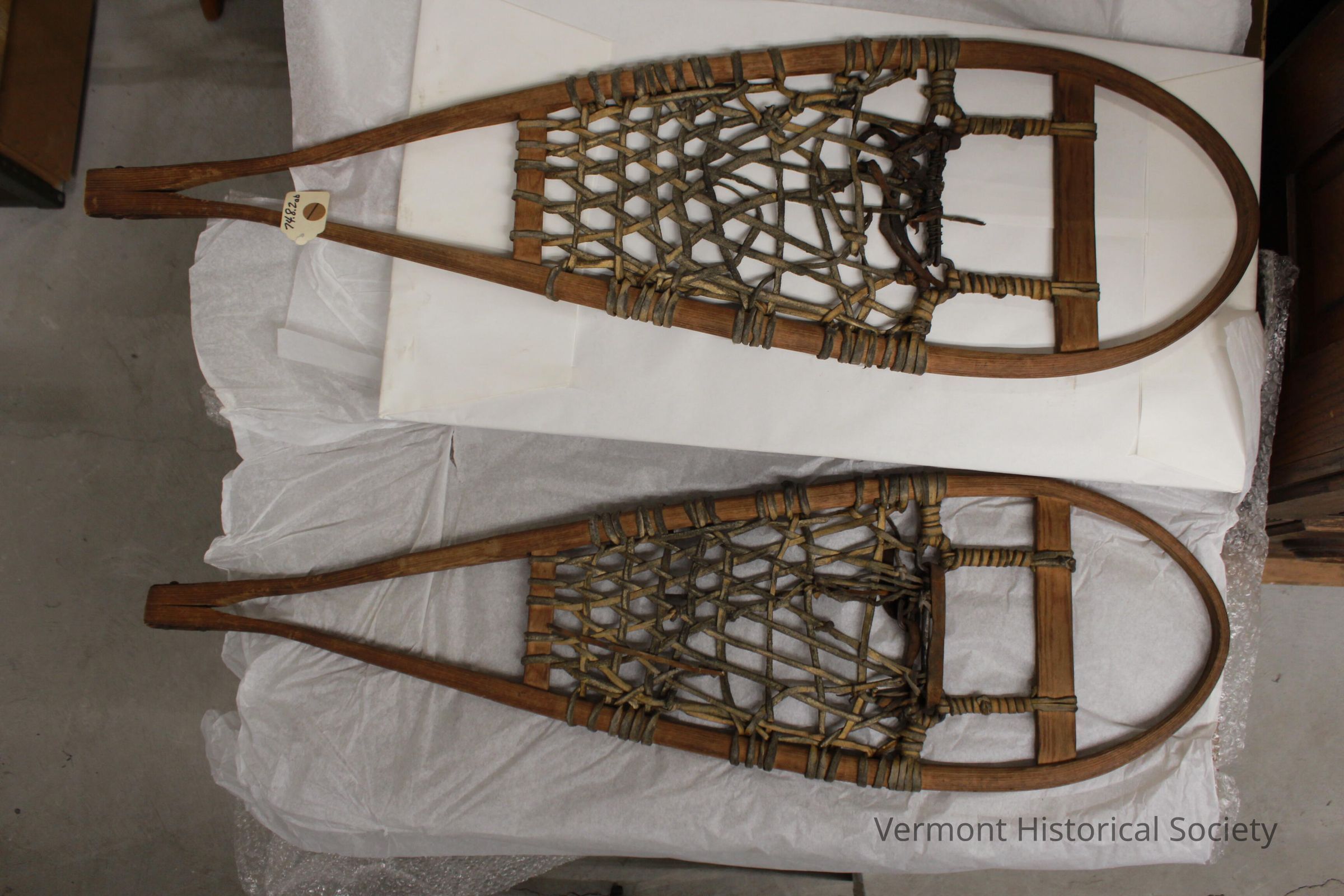 Wood and rawhide snowshoes. The snowshoes have a bent wood frame in a teardrop shape with two crossbars across the wide portion. The center of the wide portion, between the crossbars, is woven with strips of rawhide. There is a purposeful woven hole at the center front.