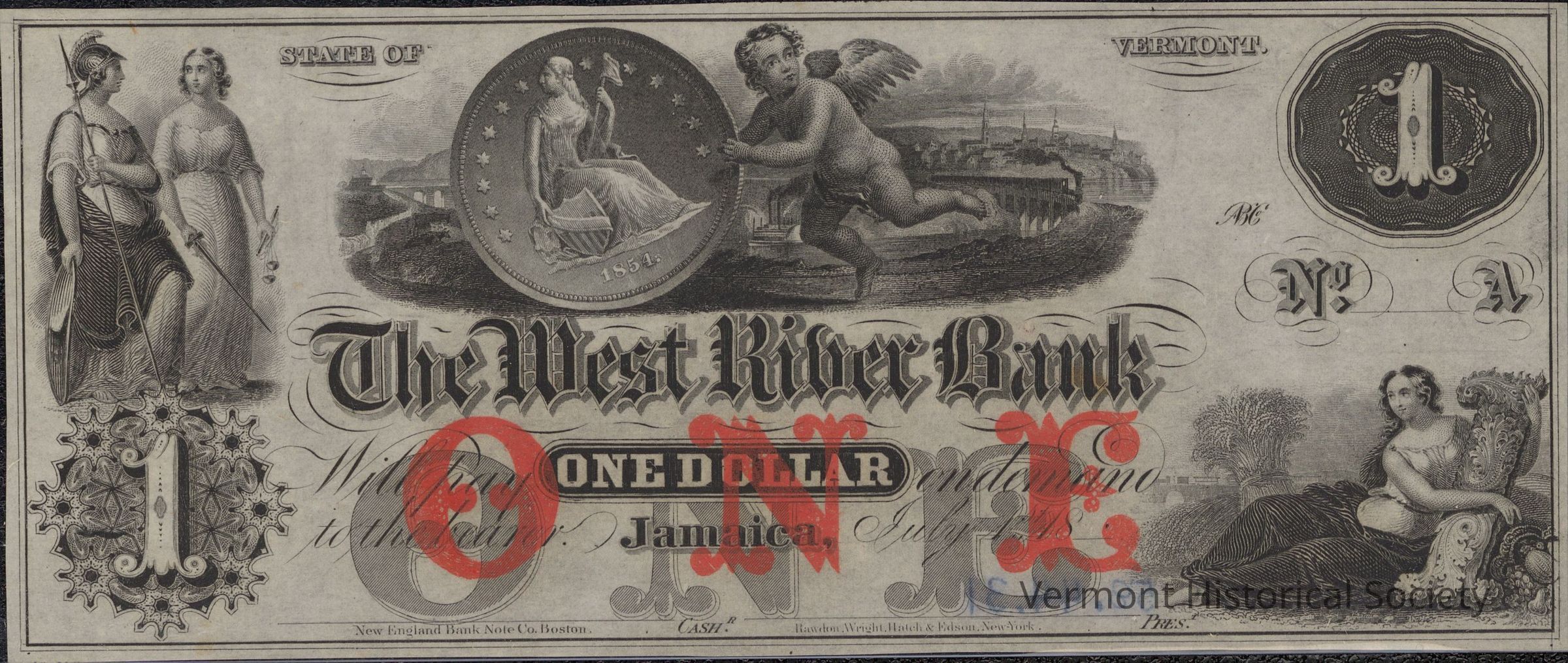 Private bank note for 2 dollars from The West River Bank in Jamaica, Vermont. It is dated July 1st, 18[blank]. It is unfilled and unsigned.