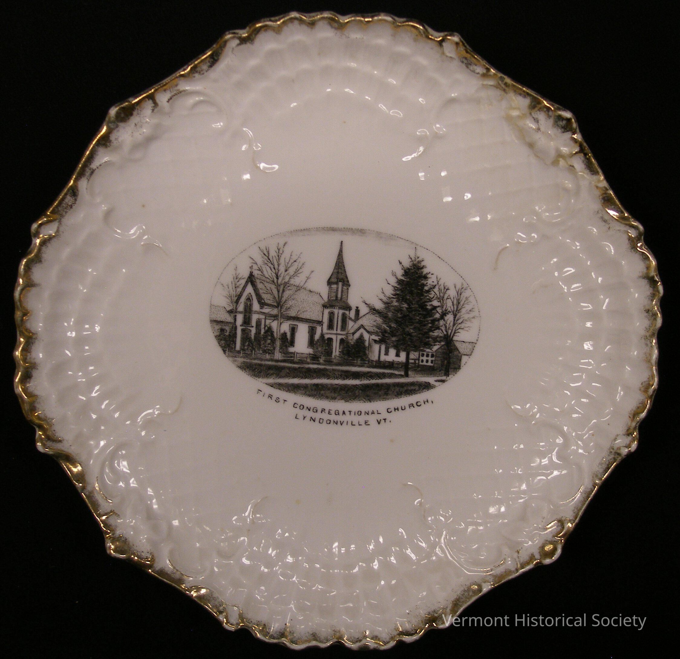 White ceramic saucer with decoratively molded rim. The molded rim alternates between shell pattern and basket weave pattern and is gilded along the edge. The center is printed with an image of a church with a central steeple. The image is labeled, "FIRST CONGREGATIONAL CHURCH, LYNDONVILL VT." The bottom is marked, "MADE IN GERMANY FOR A. W. BROCKWAY LYNDONVILLE, VT."Context