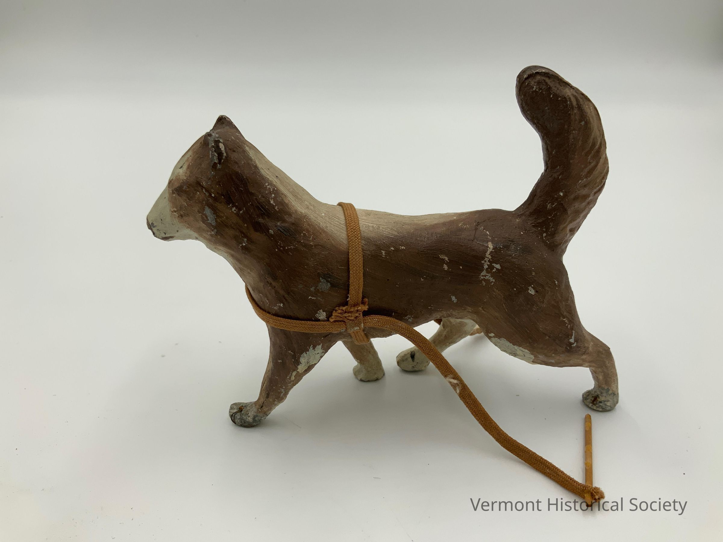 Miniature cast-iron sled dog. The dog is molded to appear as if it's walking, and there is a harness made of woven cotton tape around its body. It is painted in shades of brown. Its tail is raised upward.