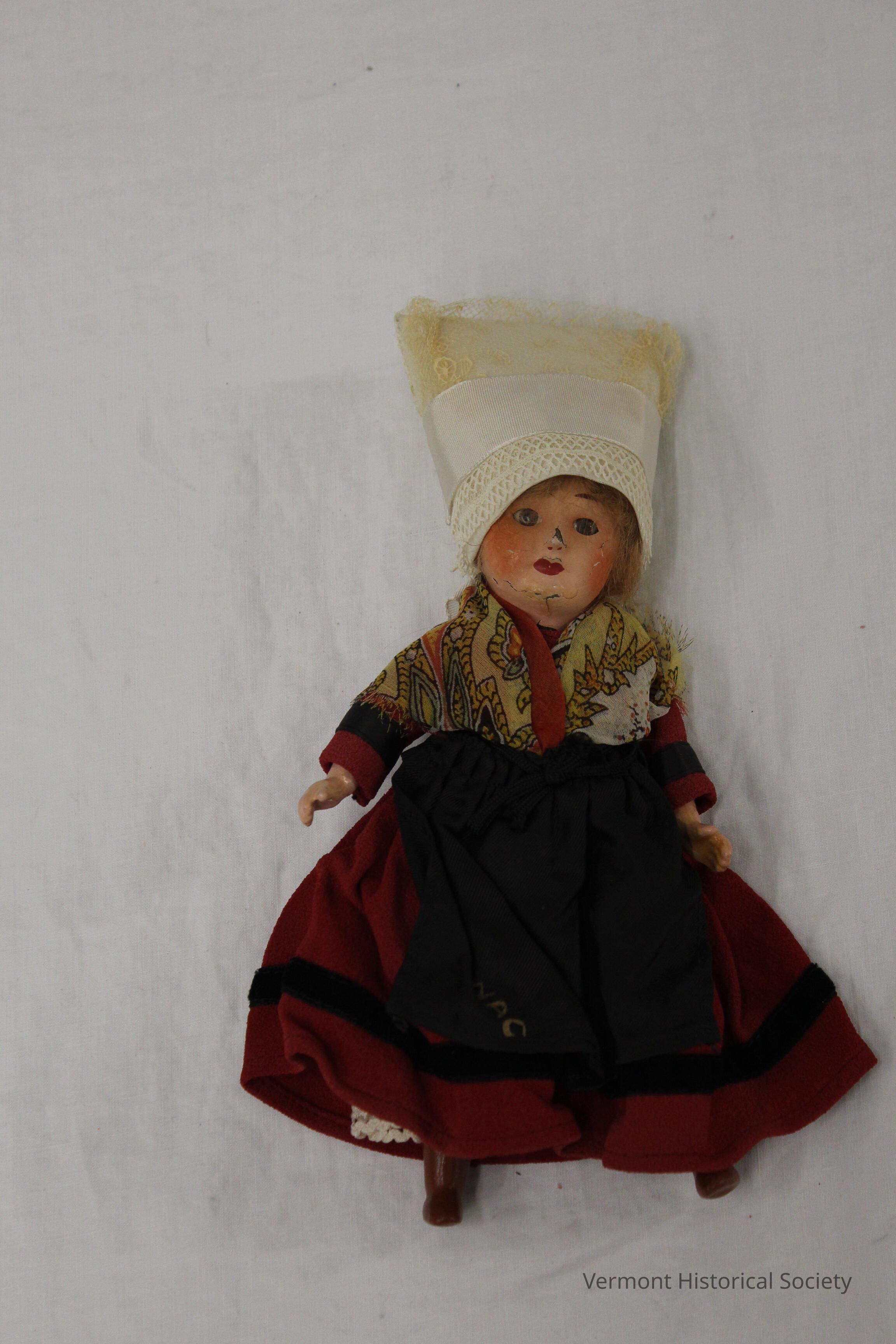 Doll in red dress with black trip, black apron with the word "cognac" printed diagonally in one corner. Yellow patterned shawl, tall hot of white ribbon and lace, red hair, chipped paint on nose, cheeks and chin.Context