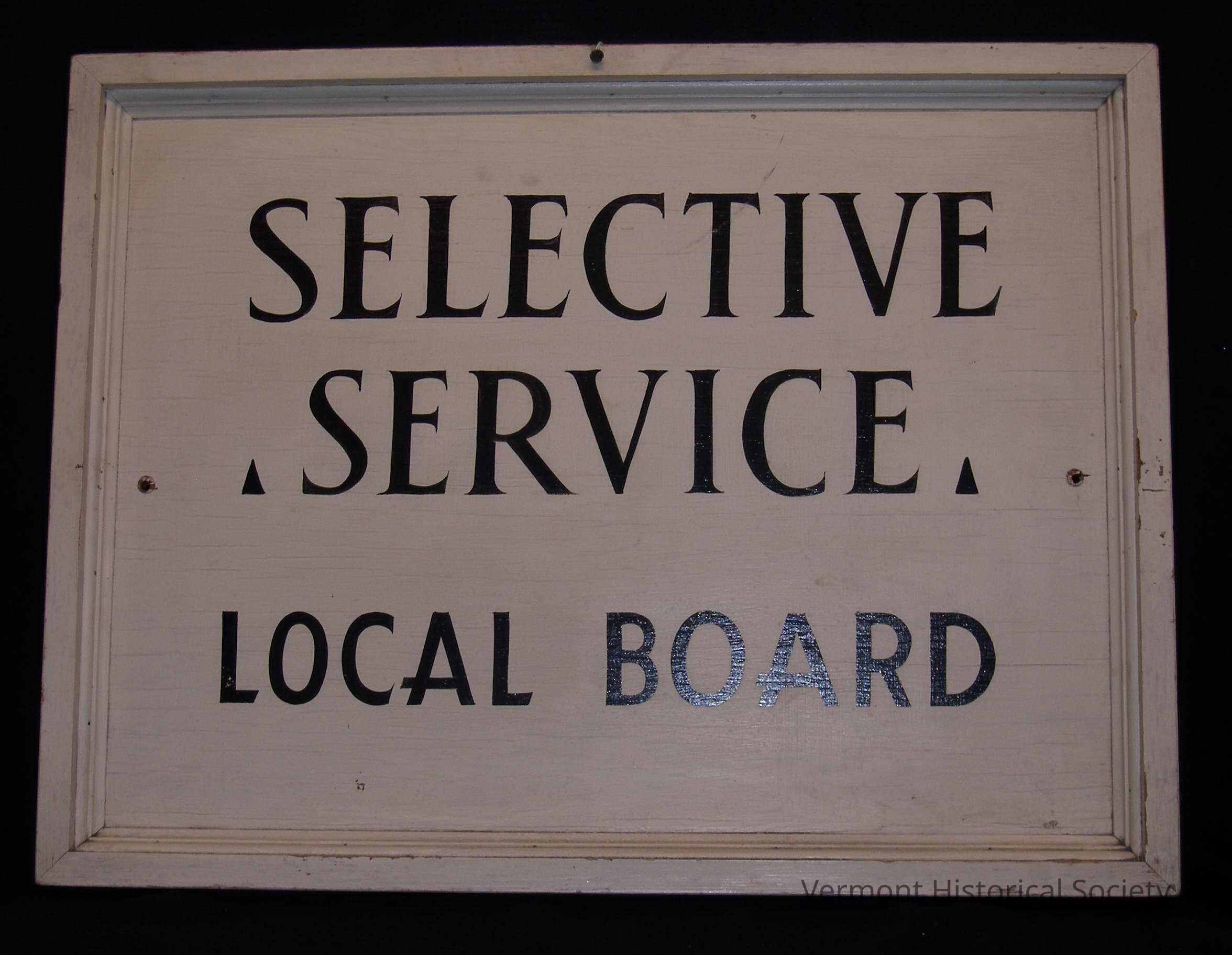 This sign hung at the offices of the Montpelier Selective Service Board during the Vietnam War. The Selective Service System is the government agency responsible for implementing the military draft.