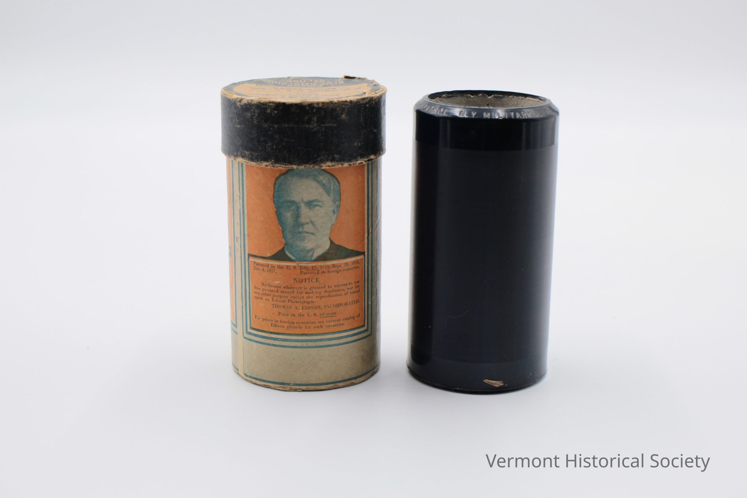 The cylinder is accompanied by a cardboard case with a top lid. The case is labeled on one side with the words, "EDISON BLUE AMBEROL RECORD", in blue on an orange ground. The other side is printed with a photographic portrait of Thomas Edison above the patent and trademark information and the price (60 cents). The lid is labeled, "3331 U. S. ARMY BUGLE CALLS PART 1 / S. W. SMITH, U. S. N., AND BULGLE SQUAD / EDISON BLUE AMBEROL RECORD".Use