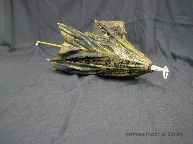 Parasol with yellow and black silk fabric. The fabric is woven with a floral design, with the flowers in black and the ground in a modeled yellow. The top is white, the handle is wood, and the crook is white.