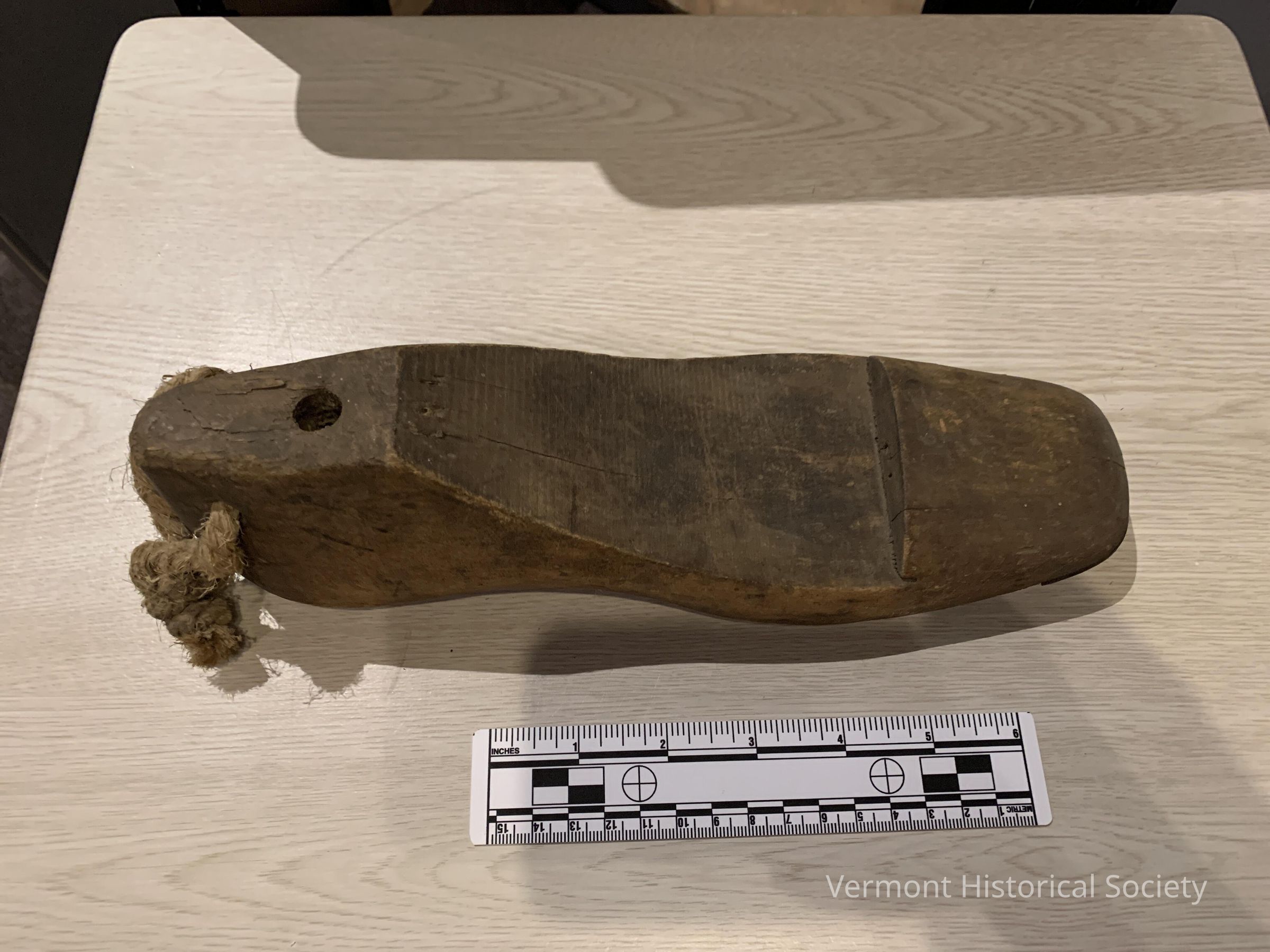 Wooden shoe last. The upper portion of the foot is cut away. There is a hole through the upper heel for hanging.