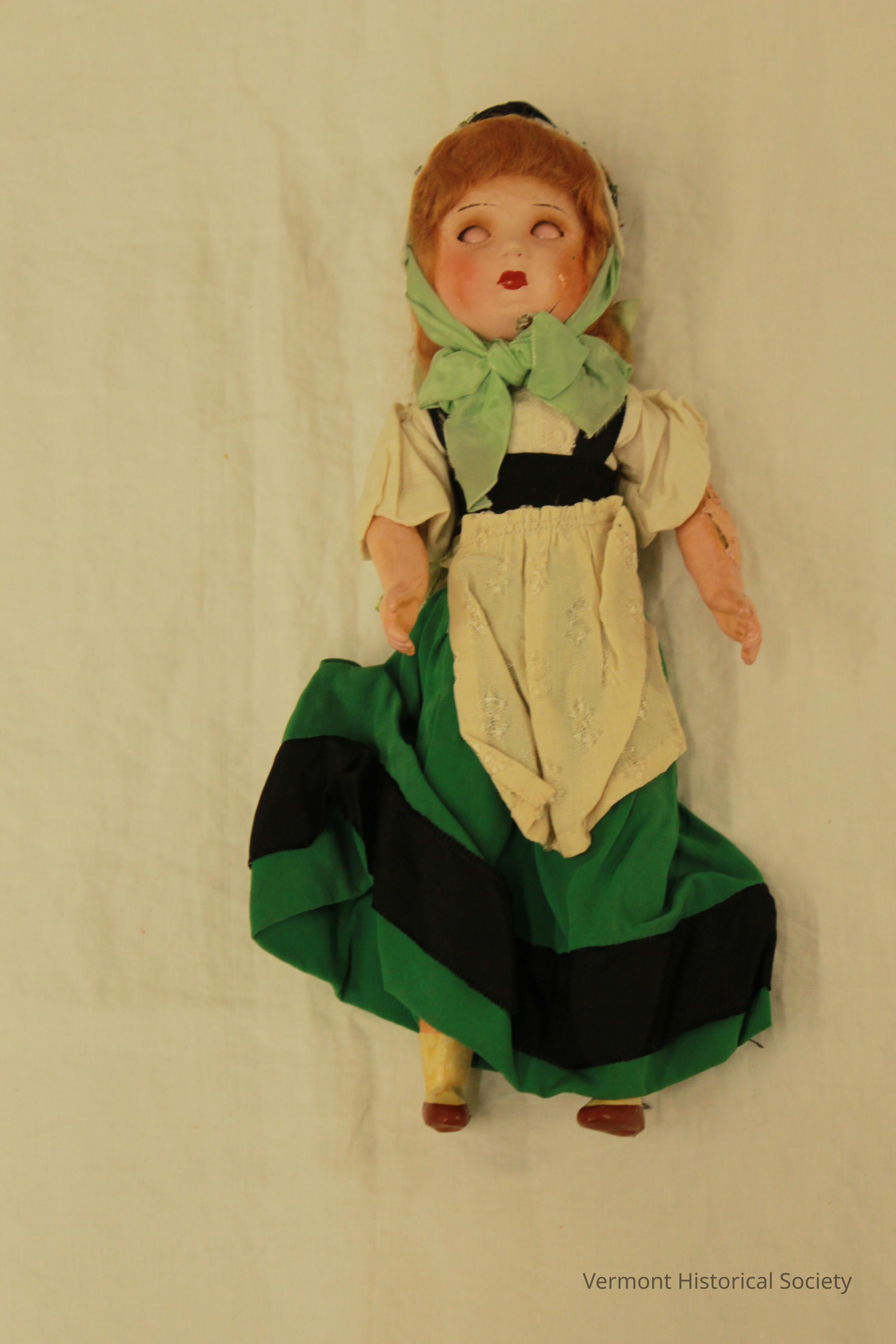 Doll in kelly green skirt with black border and white patterned blouse with heart button, black velvet cap tied with light green ribbon, red hair, eyes that open, paints cracked on arms, legs and face. Card found with doll says it is from Mr. and Mme. Arsene Baudet, 52 Rue Joseph Gaillard, Vincennes.Context
